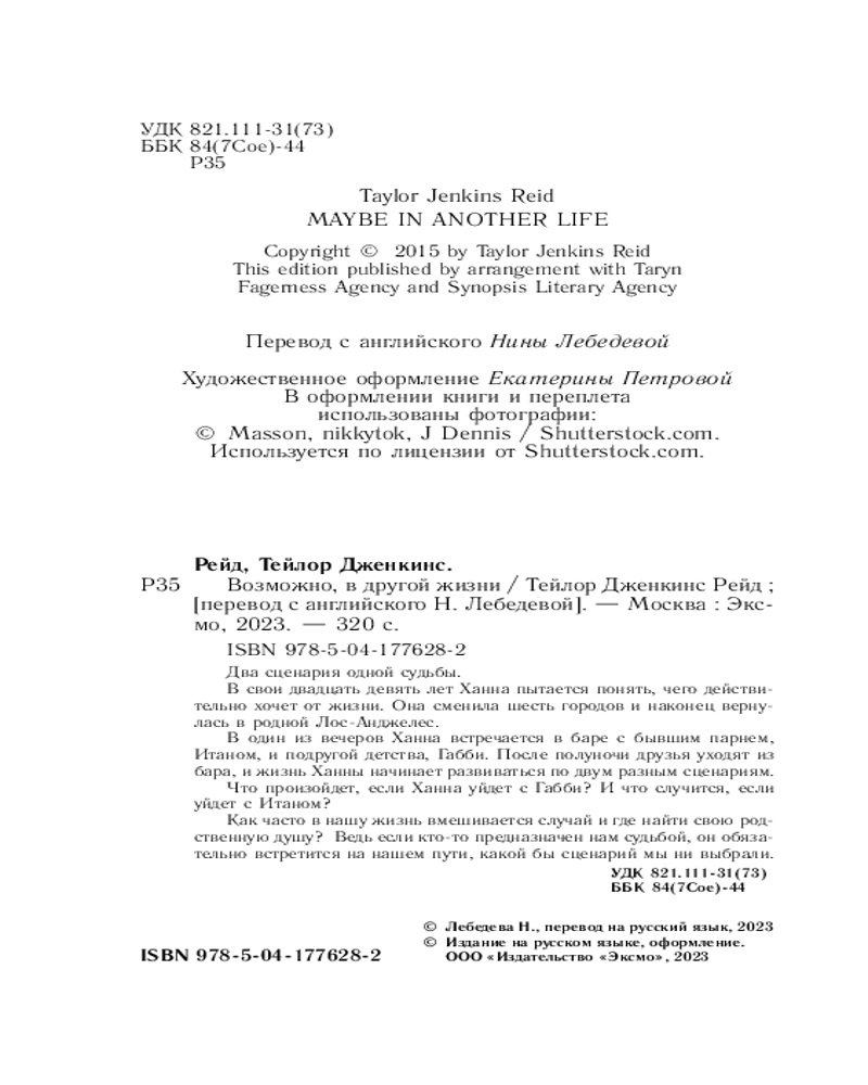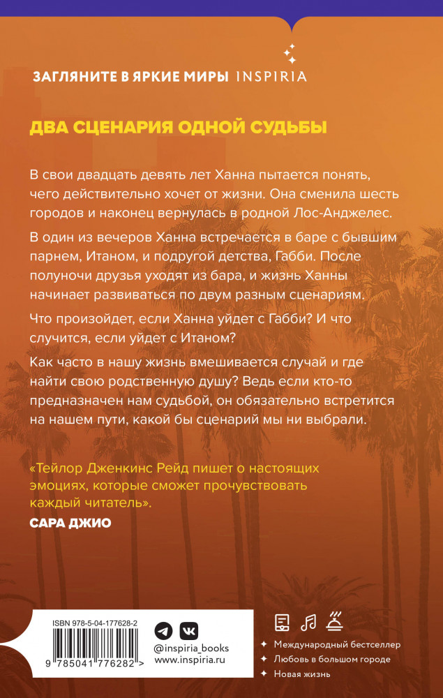 💳 Оплатить за товар можно при получении 🇰🇿 Есть бесплатная доставка по Казахстану от 1 дня 🎁 Копите бонусы с каждой покупки Серия: Novel. Мировые хиты Тейлор Дженкинс Рейд Два сценария одной судьбы. В свои двадцать девять лет Ханна пытается понять, чего действительно хочет от жизни. Она сменила шесть городов и наконец вернулась в родной Лос-Анджелес. В один из вечеров Ханна встречается в баре с бывшим парнем, Итаном, и подругой детства, Габби. После полуночи друзья уходят из бара, и жизнь Ханны начинает развиваться по двум разным сценариям. Что произойдет, если Ханна уйдет с Габби? И что случится, если уйдет с Итаном? |