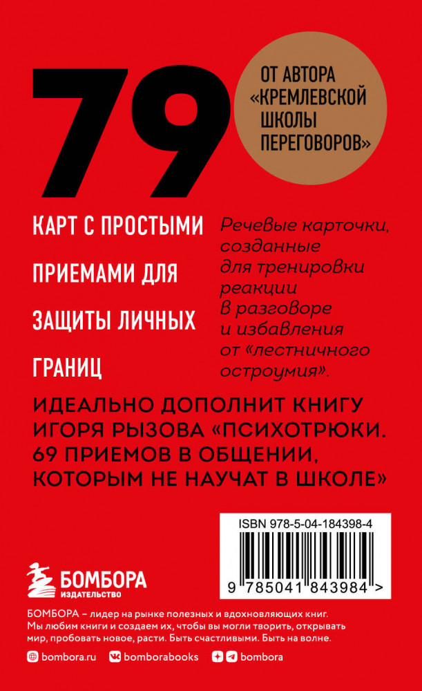 💳 Оплатить за товар можно при получении 🇰🇿 Есть бесплатная доставка по Казахстану от 1 дня 🎁 Копите бонусы с каждой покупки Серия: Кремлевская школа переговоров Речевые карточки, созданные для тренировки реакции в разговоре и избавления от «лестничного остроумия». Идеально дополнит книгу Игоря Рызова «Психотрюки. 69 приемов в общении, которым не научат в школе». |
