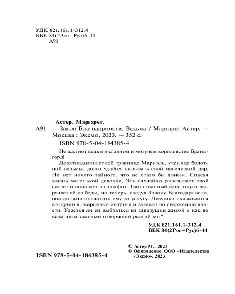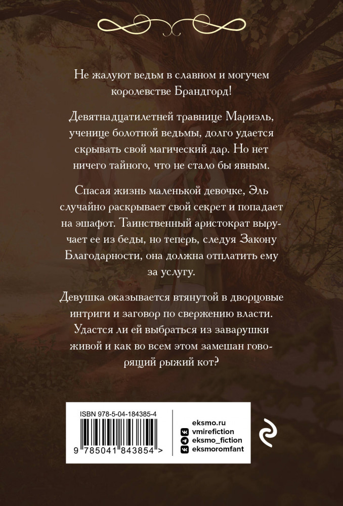 💳 Оплатить за товар можно при получении 🇰🇿 Есть бесплатная доставка по Казахстану от 1 дня 🎁 Копите бонусы с каждой покупки Серия: Романтический покет Не жалуют ведьм в славном и могучем королевстве Брандгорд! Девятнадцатилетней травнице Мариэль, ученице болотной ведьмы, долго удаётся скрывать свой магический дар. Но нет ничего тайного, что не стало бы явным. Спасая жизнь маленькой девочке, Эль случайно раскрывает свой секрет и попадает на эшафот. Таинственный аристократ выручает её из беды, но теперь, следуя Закону Благодарности, она должна отплатить ему за услугу. Девушка оказывается втянутой в дворцовые интриги и заговор по свержению власти. Удастся ли ей выбраться из заварушки живой и как во всём этом замешан говорящий рыжий кот? |
