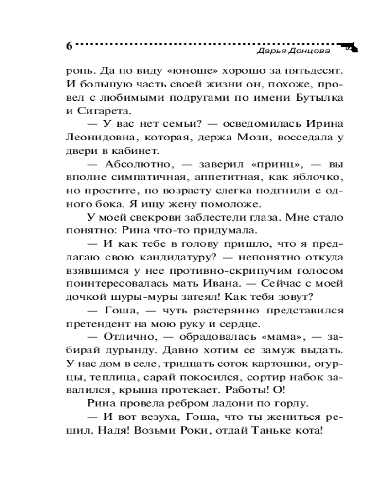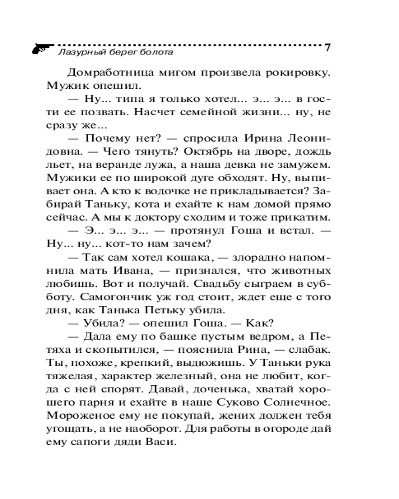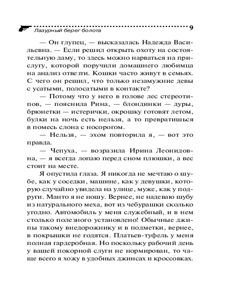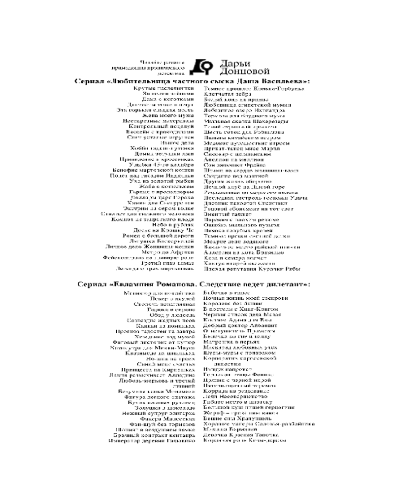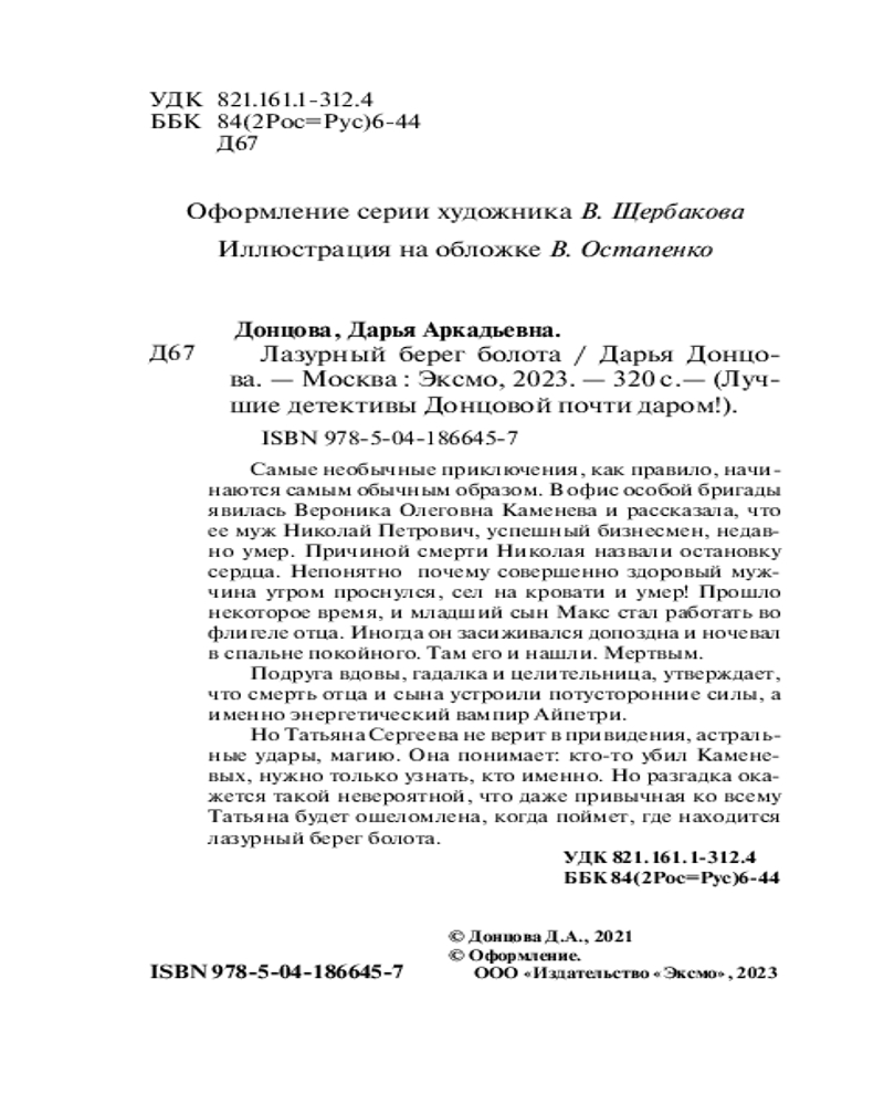 Лазурный берег болотаВ данный момент этот товар отсутствует в продаже. Возможно, у нас найдется аналогичный или похожий товар здесь. Серия: Лучшие детективы Донцовой почти даром! (обложка) Самые необычные приключения, как правило, начинаются самым обычным образом. В офис особой бригады явилась Вероника Олеговна Каменева и рассказала, что ее муж Николай Петрович, успешный бизнесмен, недавно умер. Причиной смерти Николая назвали остановку сердца. Непонятно почему совершенно здоровый мужчина утром проснулся, сел на кровати и умер! Прошло некоторое время, и младший сын Макс стал работать во флигеле отца. Иногда он засиживался допоздна и ночевал в спальне покойного. Там его и нашли. Мертвым. |