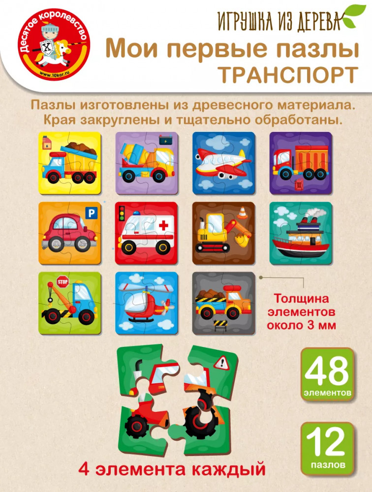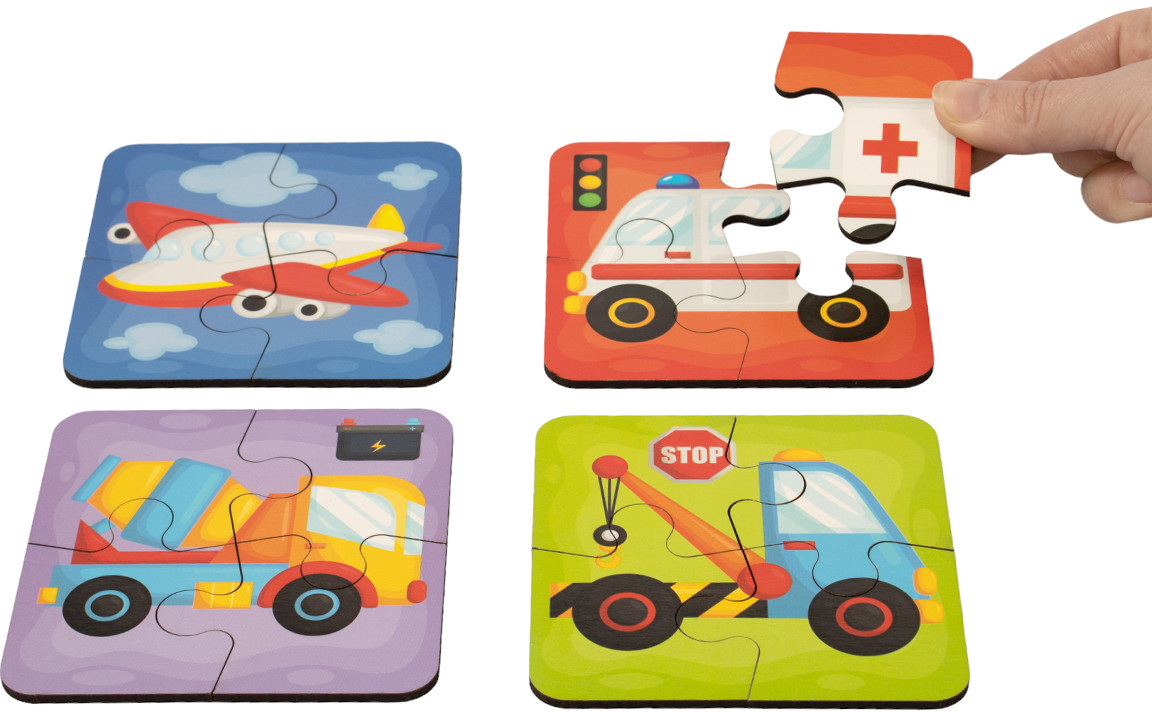 Серия: Мои первые пазлы Пазлы «Транспорт» — это классические пазлы, состоящие из 4 частей. Пазлы выполнены из высококачественного древесного материала. |