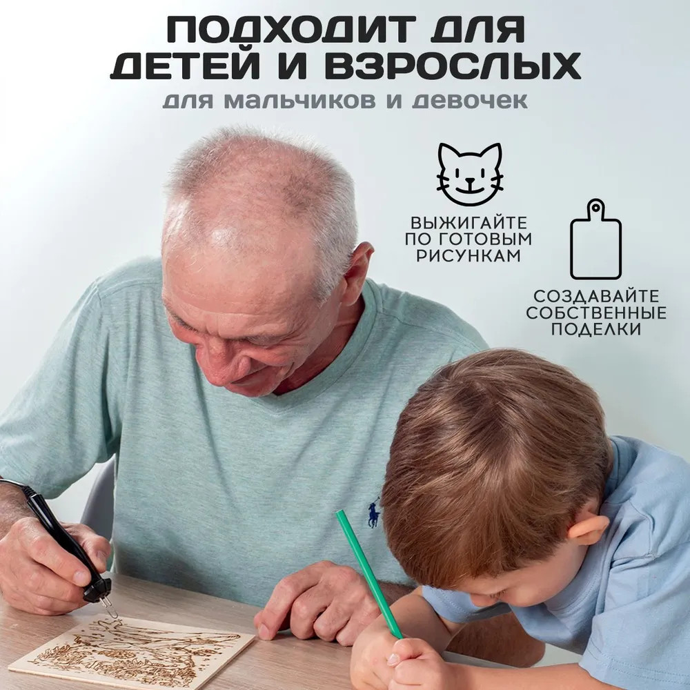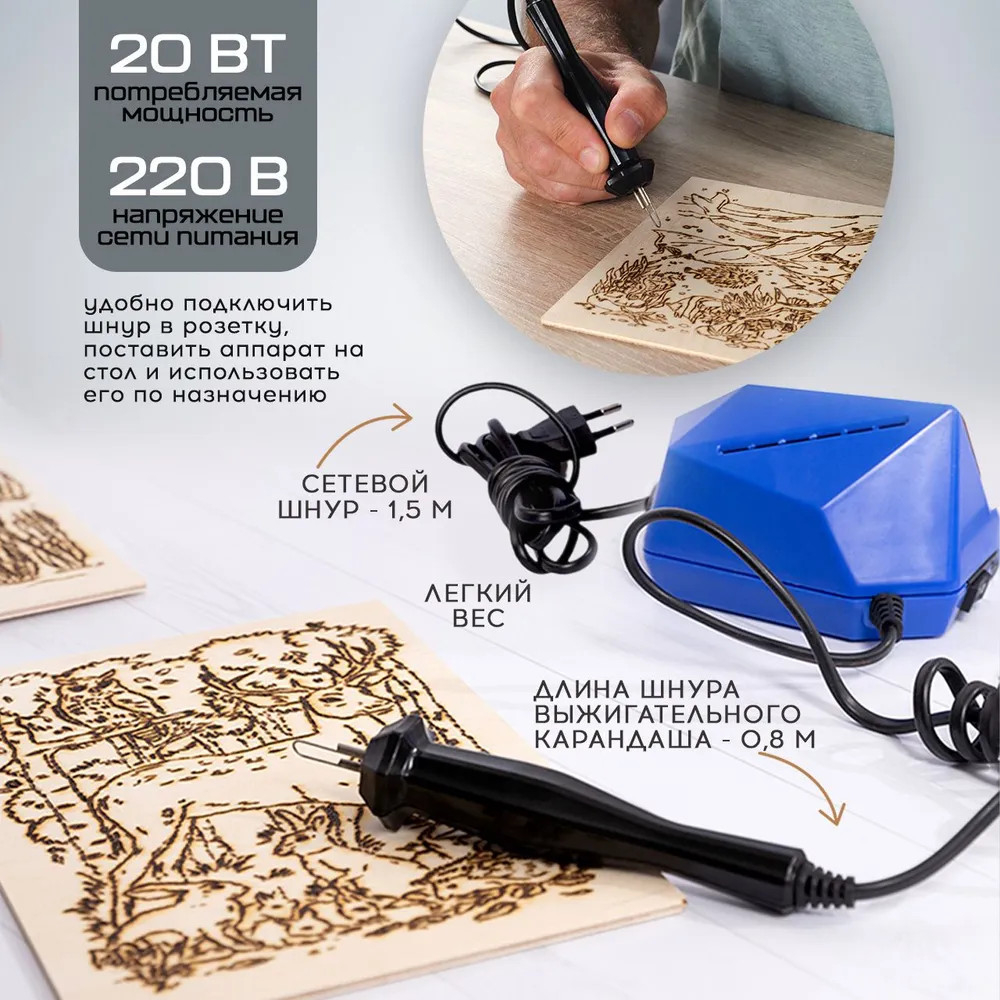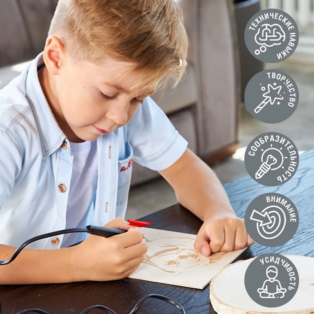 В данный момент этот товар отсутствует в продаже. Возможно, у нас найдется аналогичный или похожий товар здесь. Выжигание по дереву — это занимательный вид декоративного искусства. Владение мастерством выжигания поможет развить у ребенка трудолюбие, творческие способности, усидчивость и внимание. С помощью выжигательного прибора «Горыныч» можно украшать своими руками шкатулки, разделочные доски и любые другие деревянные предметы без лакокрасочного покрытия. Создавая поделки, дети начинают мыслить образно, нестандартно, ценить труд другого человека. Готовую поделку можно раскрасить цветными карандашами, фломастерами или красками. Перед тем, как Вы дадите ребенку этот прибор, познакомьте его с правилами безопасности, которые необходимо соблюдать.