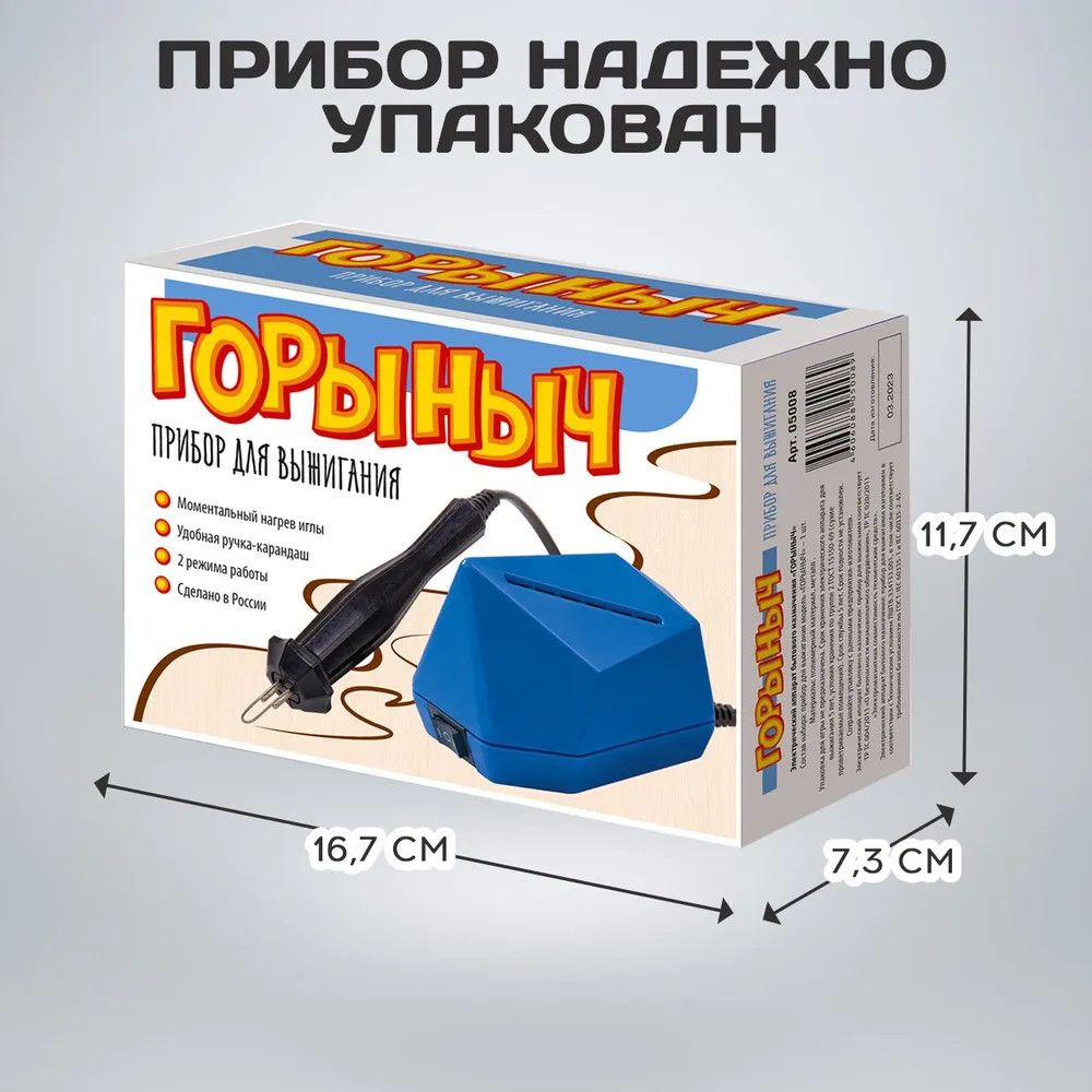 Электроприбор «Горыныч» имеет небольшие габариты, помещен в прочный пластмассовый корпус, а два режима нагрева вполне достаточно для начинающих любителей выжигания по дереву. Нагрев нихромовой иглы выжигателя осуществляется в течение 1 минуты, а остывание займет не более 3-5 минут (в зависимости от режима нагрева прибора). Это очень удобно, когда ребенок пользуется прибором вне дома, например, в школе на уроках труда или в кружках детского творчества, и на порядок снижает возможность оказаться раскаленным в ранце ребенка или ящике стола. Прибор для выжигания по дереву «Горыныч» полностью соответствует требованиям безопасности. Предназначен для детей от 14 лет.
