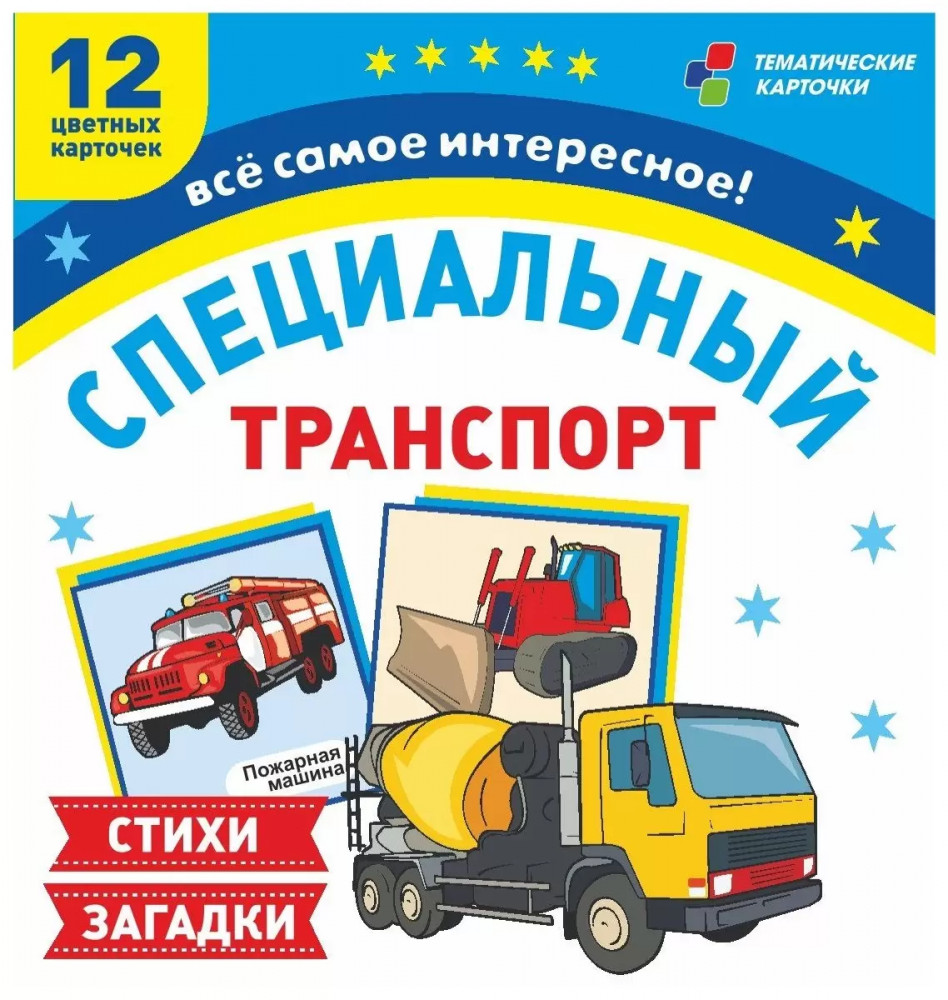 Специальный транспорт. 12 развивающих карточек с красочными картинками, стихами и загадками для занятий с детьми+36