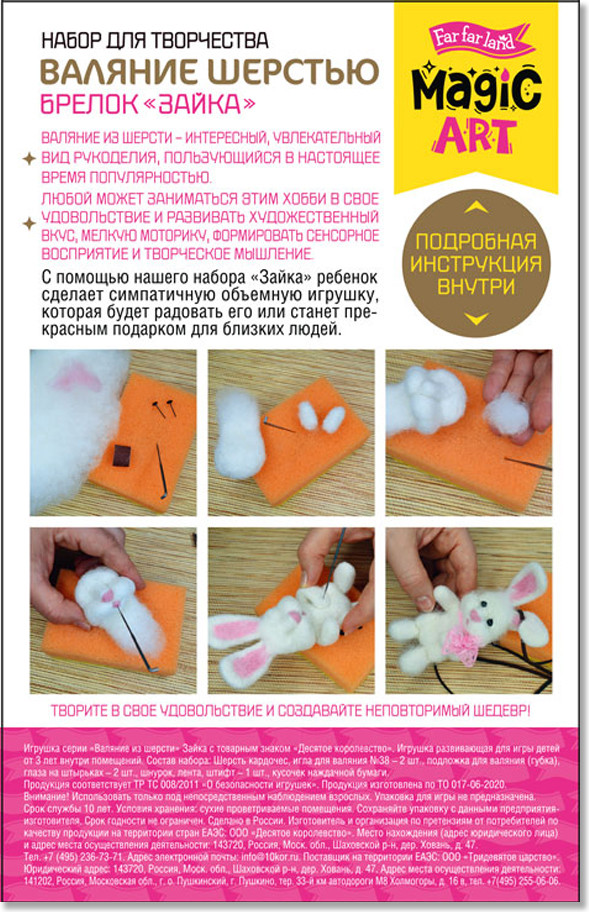 💳 Оплатить за товар можно при получении 🇰🇿 Есть бесплатная доставка по Казахстану от 1 дня 🎁 Копите бонусы с каждой покупки Серия: Magic art Валяние из шерсти — это интересный и увлекательный вид творчества, пользующийся большой популярностью. Набор для валяния из шерсти «Зайка» включает все необходимое для создания игрушки или брелока из шерсти. С помощью набора ребенок сделает симпатичную объемную игрушку, которая будет радовать его или станет прекрасным подарком для близких людей. Процесс валяния игрушек развивает художественный вкус, мелкую моторику, формирует сенсорное восприятие и творческое мышление. |