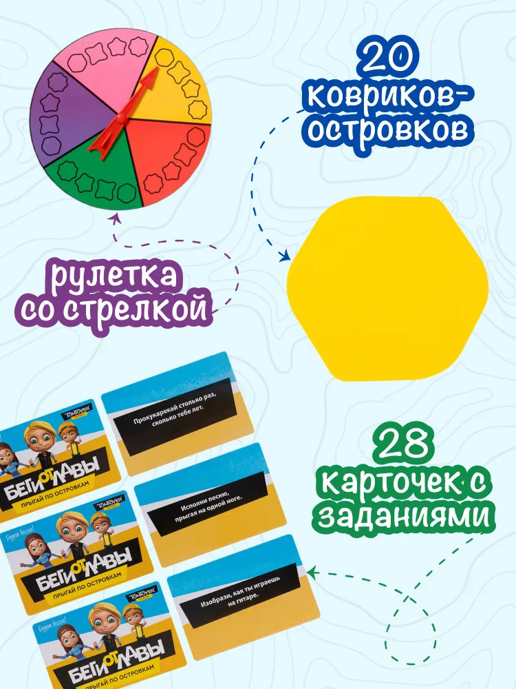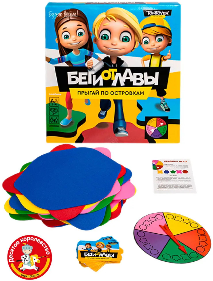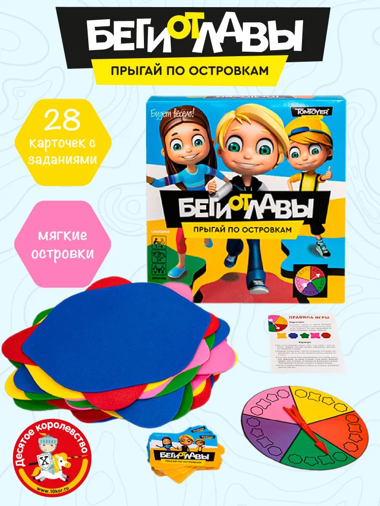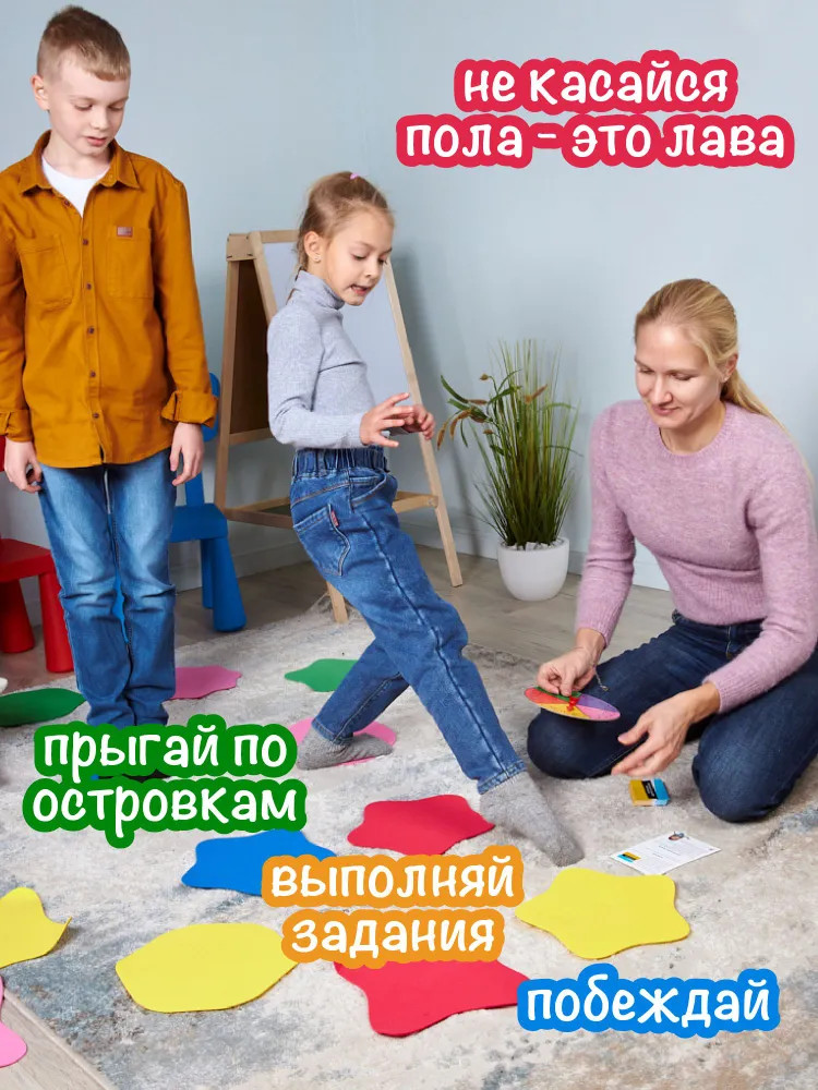 Как играть: выберите ведущего. Игра начинается со слов: "Пол — это лава!" После этого каждый участник должен занять один островок. Игрокам нельзя касаться пола, иначе они выбывают из игры. Далее ведущий раскручивает барабан, и участники должны быстро занять островок выпавшего на рулетке цвета. Игрок, который последним занял островок, должен убрать из игры островок, на котором стоял до этого. Если игрок оказался на островке со знаком "?", он должен выполнить задание с карточки. Победителем становится игрок, добравшийся первым до последнего островка.