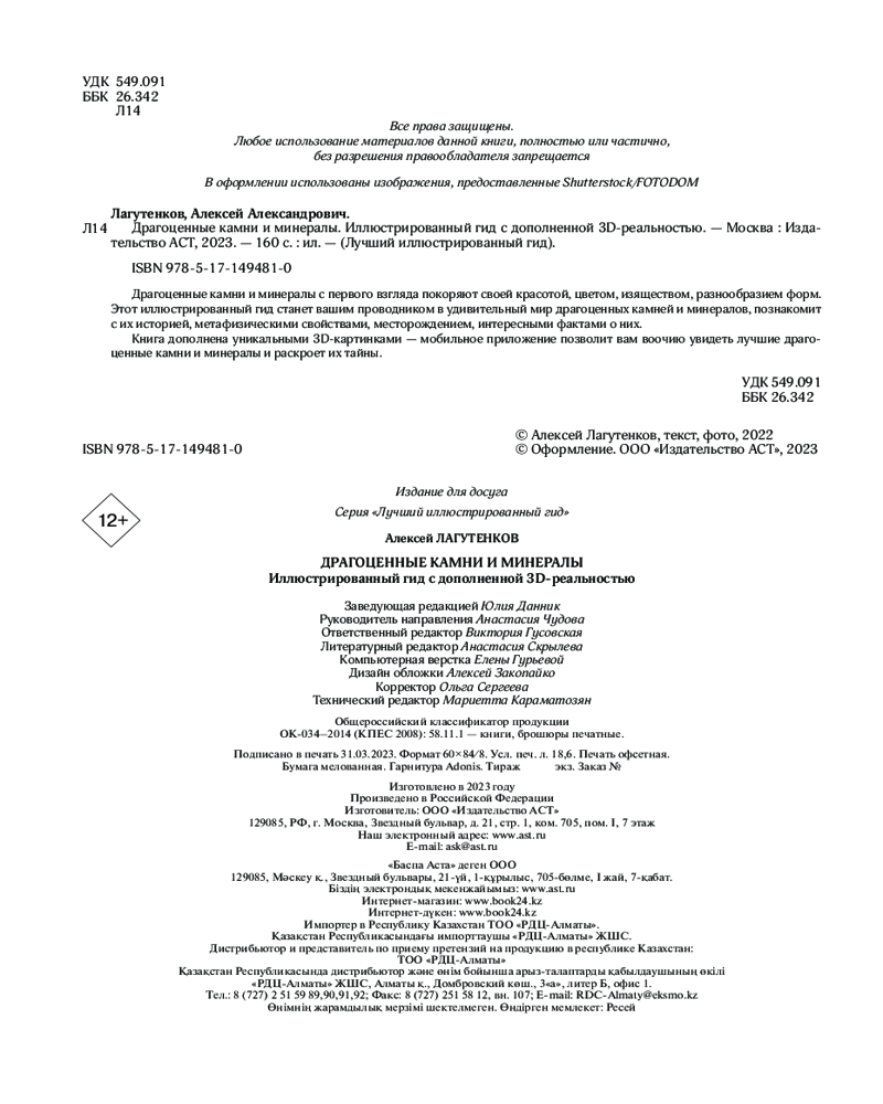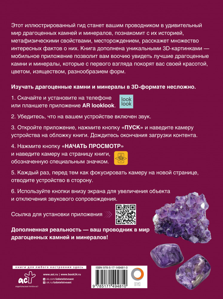 Драгоценные камни и минералы. Иллюстрированный гид с дополненной 3D-реальностьюАлексей Александрович Лагутенков В данный момент этот товар отсутствует в продаже. Возможно, у нас найдется аналогичный или похожий товар здесь. Серия: Лучший иллюстрированный гид Драгоценные камни и минералы с первого взгляда покоряют своей красотой, цветом, изяществом, разнообразием форм. Этот иллюстрированный гид станет вашим проводником в удивительный мир драгоценных камней и минералов, познакомит с их историей, метафизическими свойствами, месторождением, интересными фактами о них. Книга дополнена уникальными 3D-картинками — мобильное приложение позволит вам воочию увидеть лучшие драгоценные камни и минералы и раскроет их тайны. |