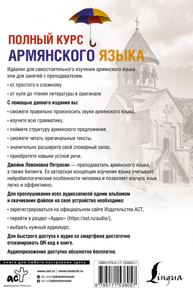 💳 Оплатить за товар можно при получении 🇰🇿 Есть бесплатная доставка по Казахстану от 1 дня 🎁 Копите бонусы с каждой покупки Серия: ПолныйКурс Джейни Левоновна Петросян — преподаватель армянского языка, а также билингв. Её авторская концепция изучения языка учитывает нейробиологические особенности человека и позволяет изучать язык легко и эффективно. Пособие содержит полноценный курс по изучению армянского языка. Книга подходит для начинающих с нуля. Вы найдёте 5 основных разделов, в которых от простого к сложному представлены все нужные для изучения темы. Данный курс содержит большое количество уроков с понятным изложением теории, сопровождаемой запоминающимися примерами и интересными заданиями для самостоятельной практики. Проверить правильность выполнения упражнений можно при помощи ключей. В книге встречаются слова, имеющие и разговорный, и литературный вариант; в таких случаях литературный отмечен звёздочкой. |