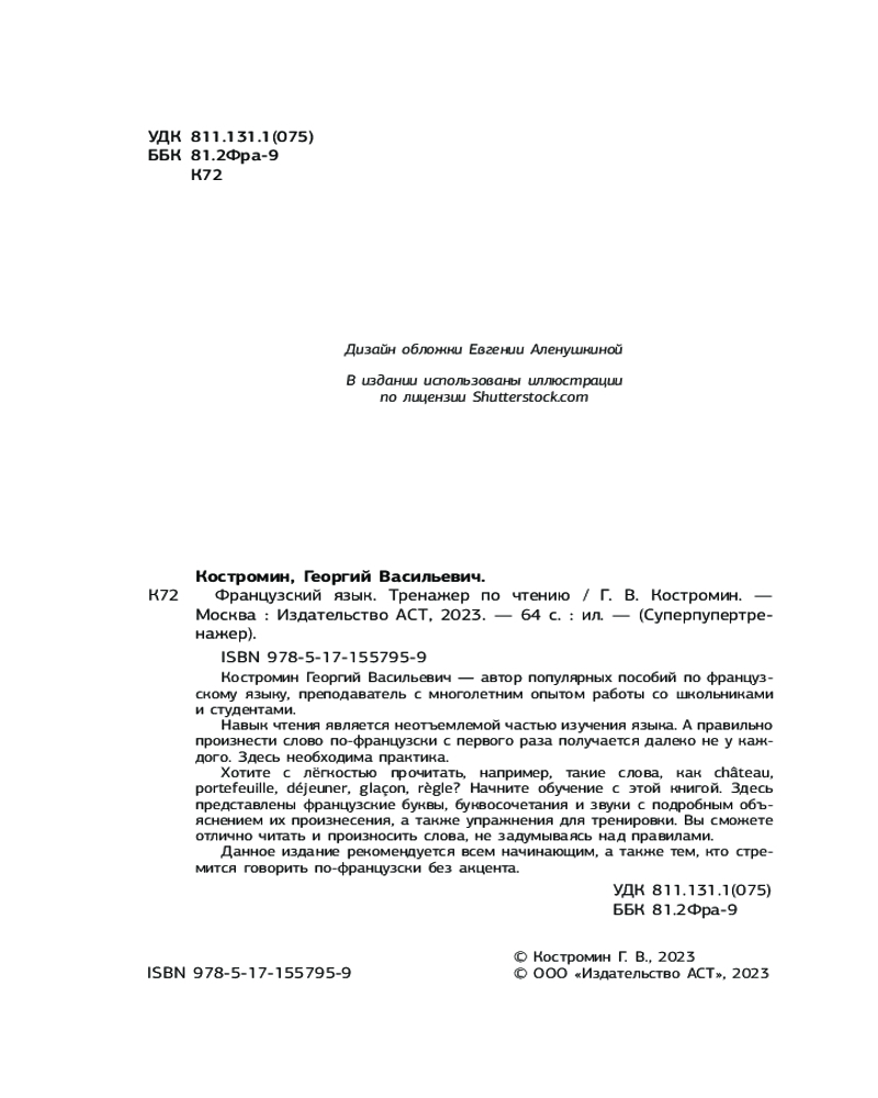 💳 Оплатить за товар можно при получении 🇰🇿 Есть бесплатная доставка по Казахстану от 1 дня 🎁 Копите бонусы с каждой покупки Серия: Суперпупертренажер Костромин Георгий Васильевич — автор популярных пособий по французскому языку, преподаватель с многолетним опытом работы со школьниками и студентами. Навык чтения является неотъемлемой частью изучения языка. А правильно произнести слово по-французски с первого раза получается далеко не у каждого. Здесь необходима практика. Хотите с лёгкостью прочитать, например, такие слова, как château, portefeuille, déjeuner, glaçon, règle? Начните обучение с этой книгой. Здесь представлены французские буквы, буквосочетания и звуки с подробным объяснением их произнесения, а также упражнения для тренировки. Вы сможете отлично читать и произносить слова, не задумываясь над правилами. Данное издание рекомендуется всем начинающим, а также тем, кто стремится говорить по-французски без акцента. |