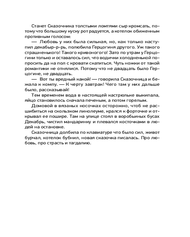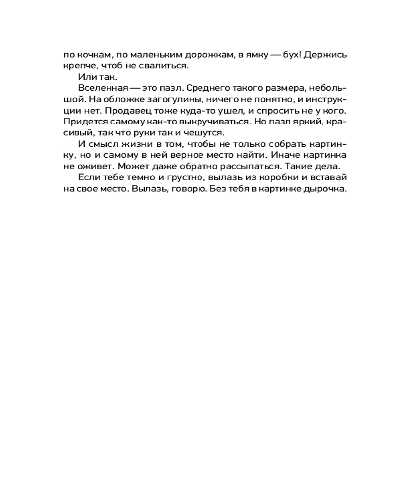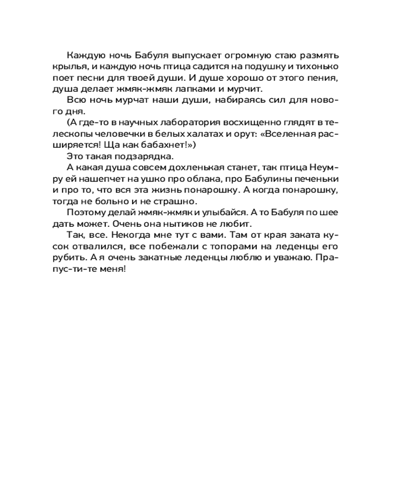 💳 Оплатить за товар можно при получении 🇰🇿 Есть бесплатная доставка по Казахстану от 1 дня 🎁 Копите бонусы с каждой покупки Серия: Секреты счастья Книга с «успокоительным» эффектом!Когда всё наскучило, замучило и надоело, на помощь придет сборник уютных терапевтических сказок Зои Арефьевой «Обнимашки с мурозданием»! С этой книгой любой загрустивший взрослый сможет отвлечься от повседневных забот и немного поразмышлять в компании проникновенных героев — о смысле жизни, о люби, о счастье, о вдохновении и прочих «важностях». А еще — найти для себя мудрую мысль и превратить ее в девиз каждого нового дня. Добрые и трогательные истории с щепоткой юмора, житейской философии и волшебства подскажут читателям верное решение и поднимут настроение при любой душевной непогоде. |