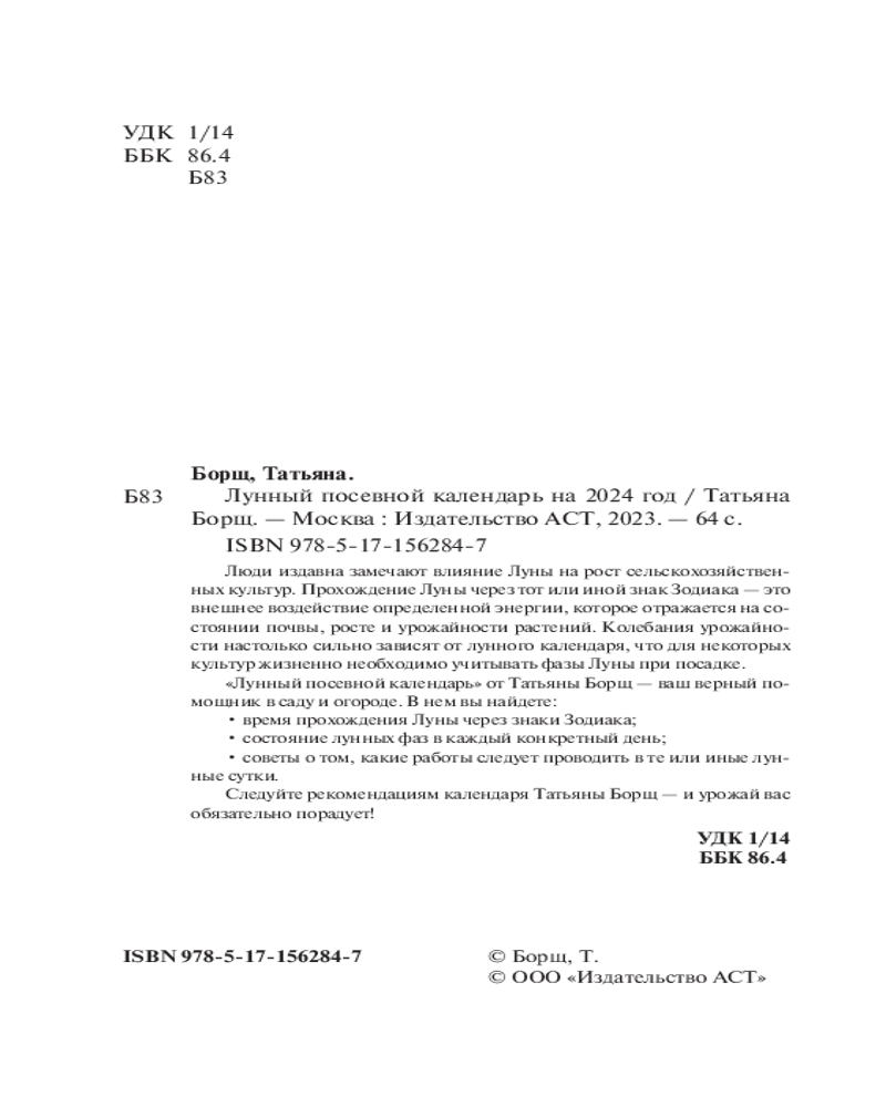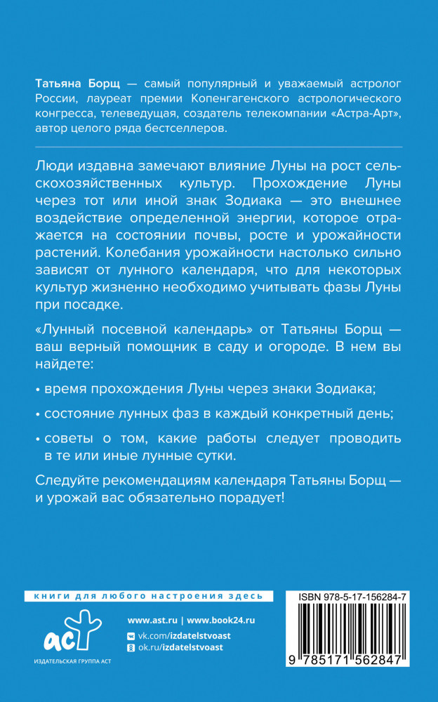 💳 Оплатить за товар можно при получении 🇰🇿 Есть бесплатная доставка по Казахстану от 1 дня 🎁 Копите бонусы с каждой покупки Серия: Борщ. Календари 2024 Татьяна Борщ — самый популярный и уважаемый астролог России, лауреат премии Копенгагенского астрологического конгресса, телеведущая, создатель телекомпании «Астра-Арт», автор целого ряда бестселлеров. Люди издавна замечают влияние Луны на рост сельскохозяйственных культур. Прохождение Луны через тот или иной знак Зодиака — это внешнее воздействие определенной энергии, которое отражается на состоянии почвы, росте и урожайности растений. Колебания урожайности настолько сильно зависят от лунного календаря, что для некоторых культур жизненно необходимо учитывать фазы Луны при посадке. |