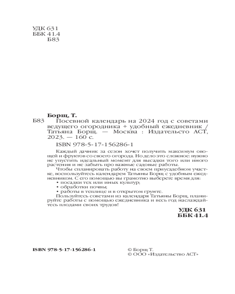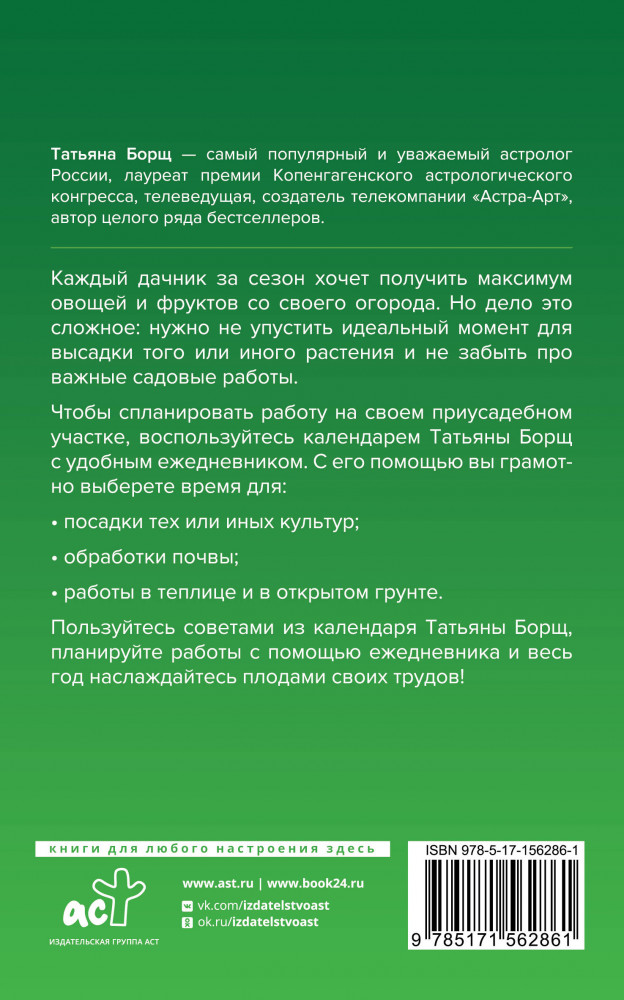 В данный момент этот товар отсутствует в продаже. Возможно, у нас найдется аналогичный или похожий товар здесь. Серия: Борщ. Календари 2024 Татьяна Борщ — самый популярный и уважаемый астролог России, лауреат премии Копенгагенского астрологического конгресса, телеведущая, создатель телекомпании «Астра-Арт», автор целого ряда бестселлеров. Каждый дачник за сезон хочет получить максимум овощей и фруктов со своего огорода. Но дело это сложное: нужно не упустить идеальный момент для высадки того или иного растения и не забыть про важные садовые работы.