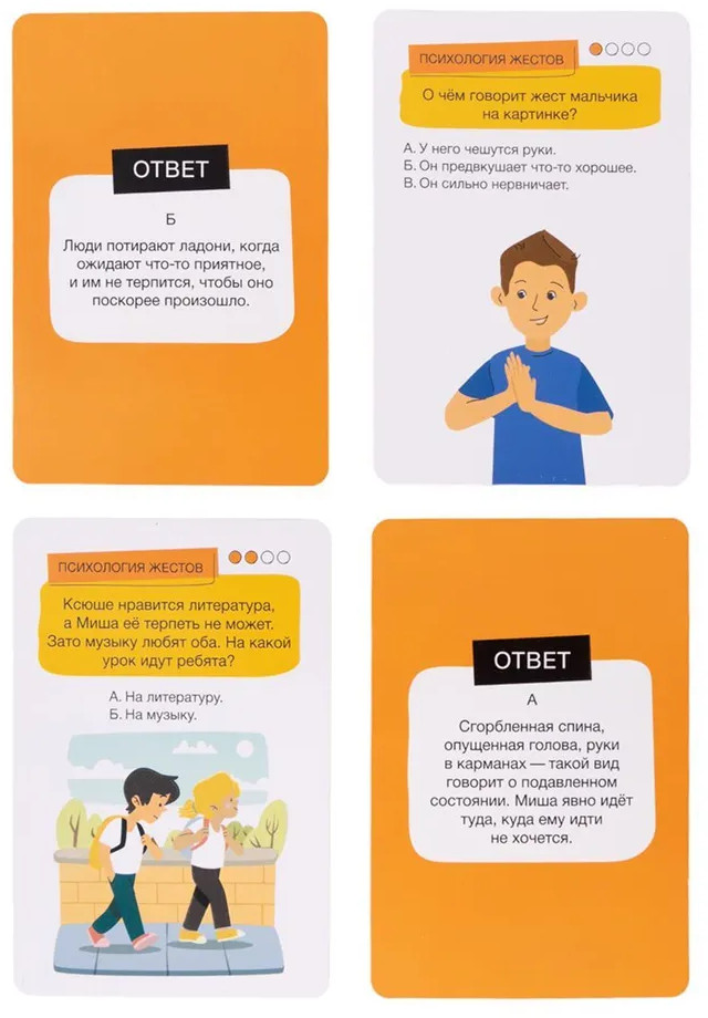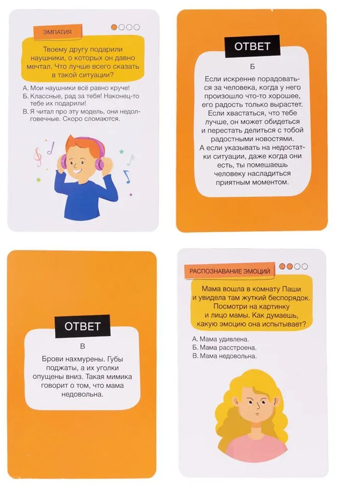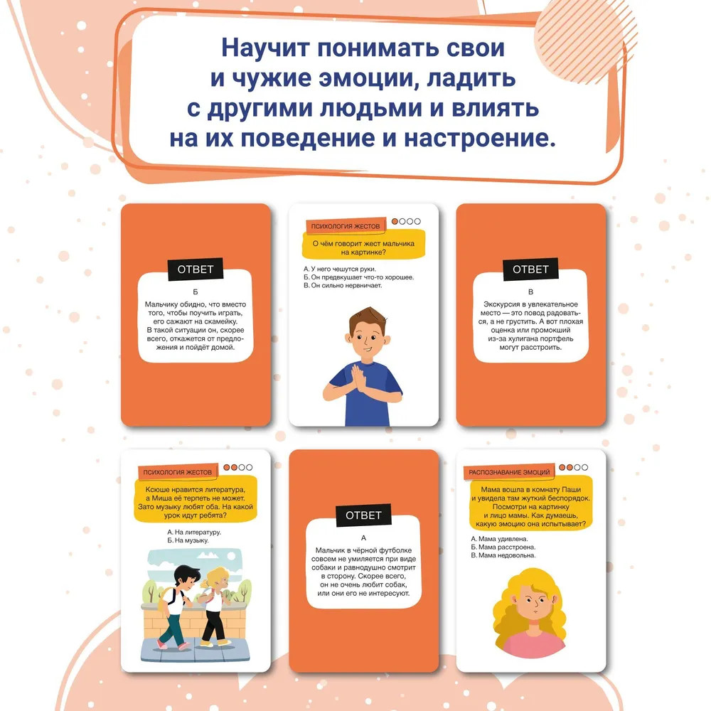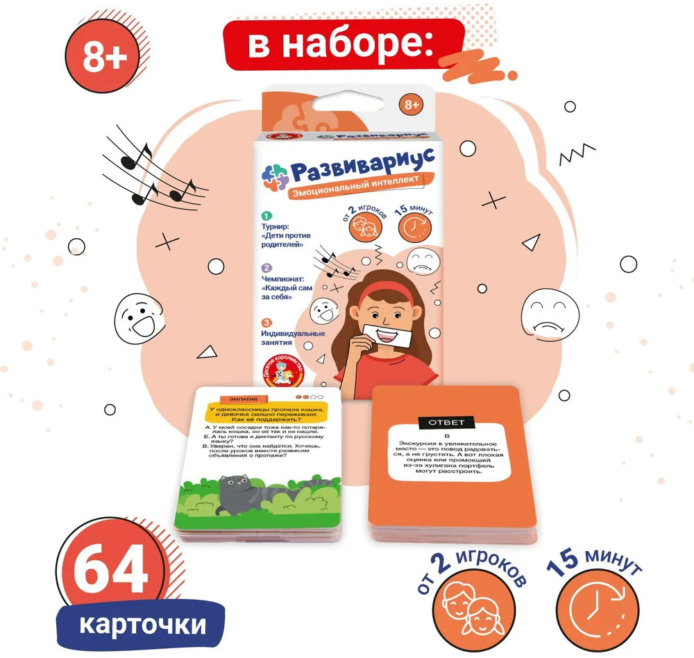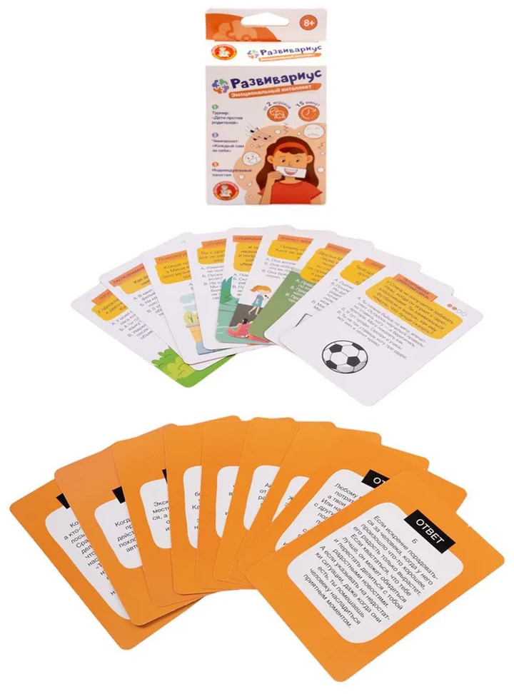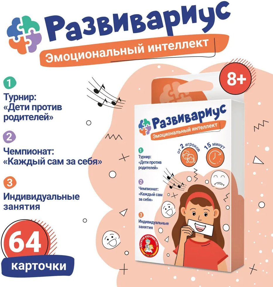💳 Оплатить за товар можно при получении 🇰🇿 Есть бесплатная доставка по Казахстану 🎁 Копите бонусы с каждой покупки Настольная игра для детей «Развивариус. Эмоциональный интеллект» — это игра, которая научит понимать свои и чужие эмоции, ладить с другими людьми и влиять на их поведение и настроение. Играть можно вдвоем с ребенком и устраивать целые турниры между командами. Игра способствует эмоциональному развитию ребенка, повышает уровень знаний и расширяет кругозор. |