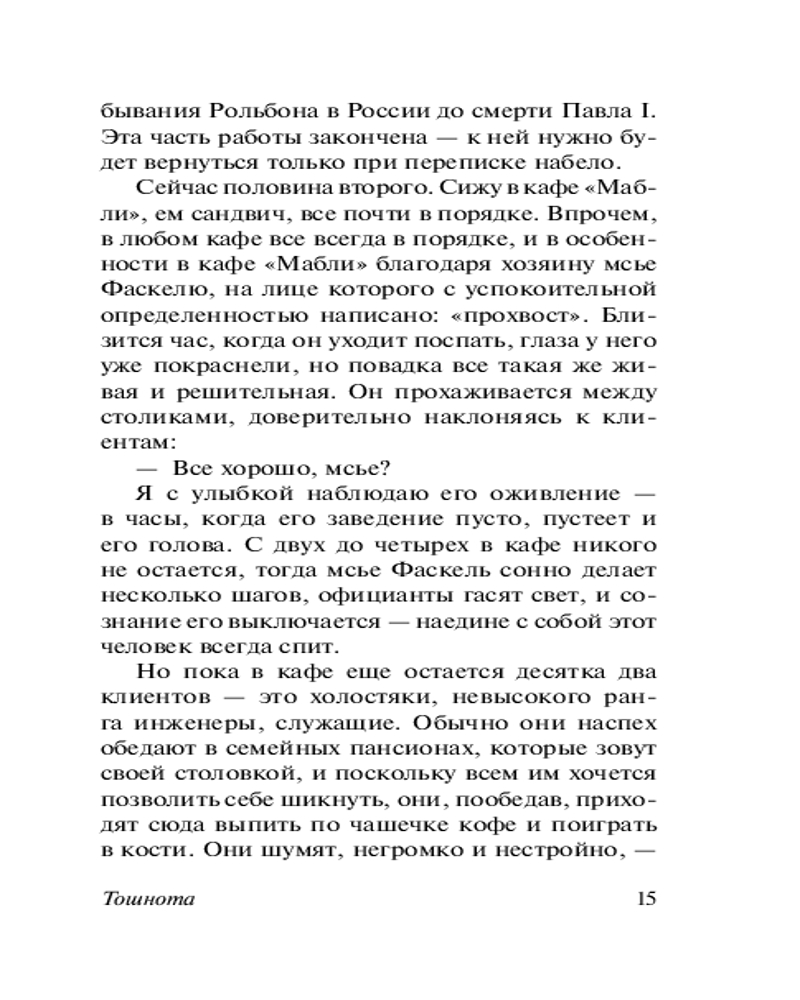 💳 Оплатить за товар можно при получении 🇰🇿 Есть бесплатная доставка по Казахстану от 1 дня 🎁 Копите бонусы с каждой покупки Серия: Книга на все времена (нов/м) Тошнота — это суть бытия людей, застрявших «в сутолоке дня». Людей — брошенных на милость чуждой, безжалостной, безотрадной реальности. Тошнота — это невозможность любви и доверия, это — попросту — неумение мужчины и женщины понять друг друга. Тошнота — это та самая «другая сторона отчаяния», по которую лежит Свобода. Но — что делать с этой проклятой свободой человеку, осатаневшему от одиночества?.. |
