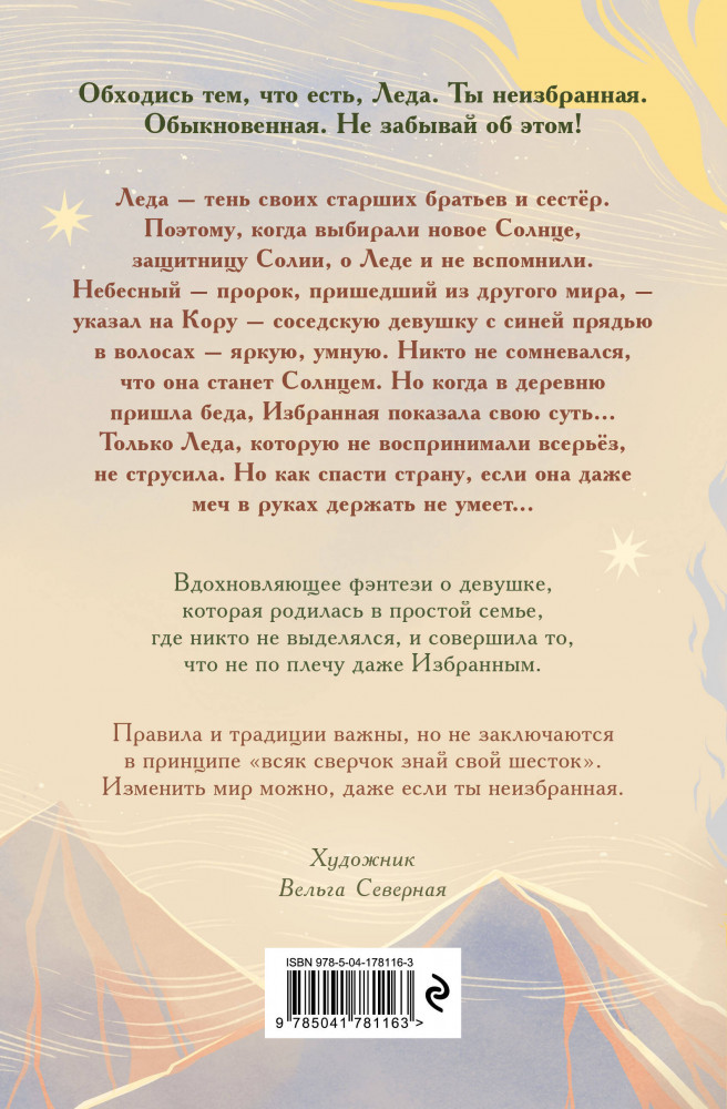 Серия: Славянские миры. Фэнтези для подростков Леда — тень своих старших братьев и сестёр. Поэтому, когда выбирали новое Солнце, защитницу Солии, о Леде и не вспомнили. Небесный — пророк, пришедший из другого мира — указал на Кору, соседскую девушку с синей прядью в волосах — яркую, умную. Никто не сомневался, что она станет Солнцем. Но когда в деревню пришла беда, Избранная показала свою суть... И только Леда, которую никогда не воспринимали всерьёз, не струсила. Но как ей спасти страну, если она даже меч в руках держать не умеет... |