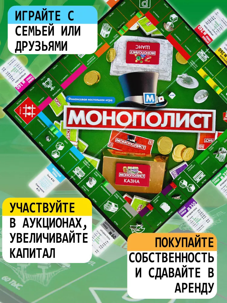 💳 Оплатить за товар можно при получении 🇰🇿 Есть бесплатная доставка по Казахстану от 1 дня 🎁 Копите бонусы с каждой покупки Монополист — крупный предприниматель, который контролирует весь рынок. Звучит заманчиво, не правда ли? Покори большой город своим обаянием и жесткой стратегией: покупай, продавай и сдавай в аренду любые здания. Количество игроков: от 2 до 6 бизнесменов. Цель игры: стать самым успешным бизнесменом, сохранив капитал. |
