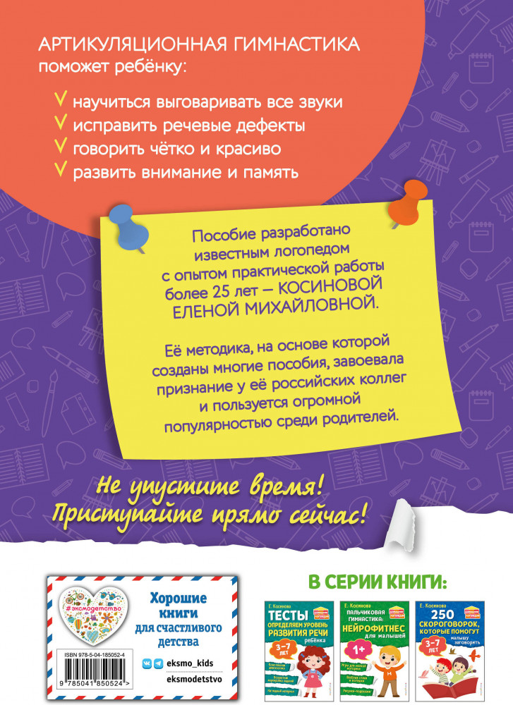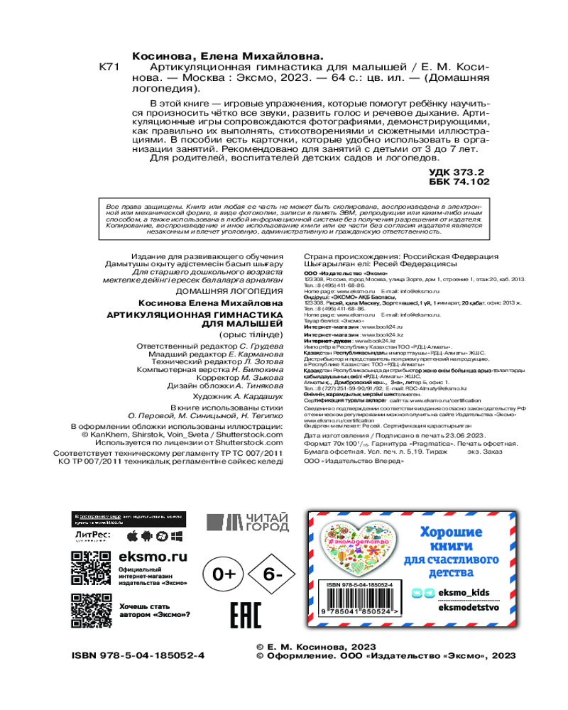 💳 Оплатить за товар можно при получении 🇰🇿 Есть бесплатная доставка по Казахстану от 1 дня 🎁 Копите бонусы с каждой покупки Серия: Домашняя логопедия Цель пособия — научить малыша говорить четко и внятно, не обращаясь за помощью к профессионалам. В нем использована авторская методика, которая давно завоевала признание специалистов и активно используется ими в работе с детьми. В книге дан полный комплекс упражнений для занятий по улучшению речи ребенка. Яркие сюжетные иллюстрации, интересные и понятные задания, веселые стихи и истории, фотографии, показывающие, как выполнять упражнения, сделают занятия легкими и приятными для ребенка и взрослого. |