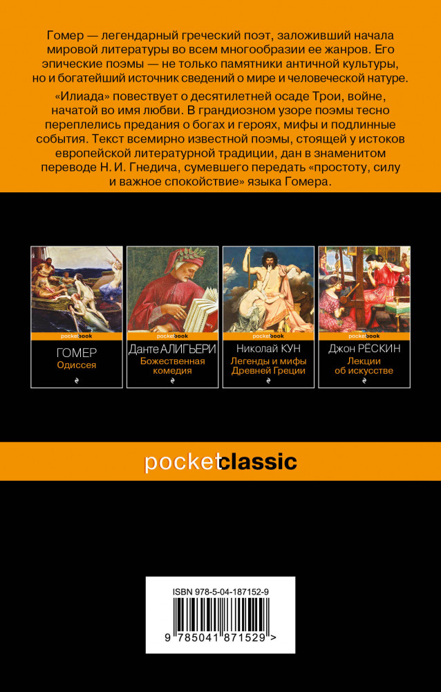 Серия: Pocket Book (обложка) Гомер заложил начала мировой литературы, все многообразие ее жанров. Его «Илиада» и «Одиссея» — не только памятники античной культуры, но и богатейший источник сведений о мире и человеческой натуре. «Илиада» повествует об одном из поворотных моментов истории Древней Греции, десятилетней осаде Трои, войне, начатой во имя любви. Здесь тесно переплелись предания о богах и героях, мифы и подлинные события. |