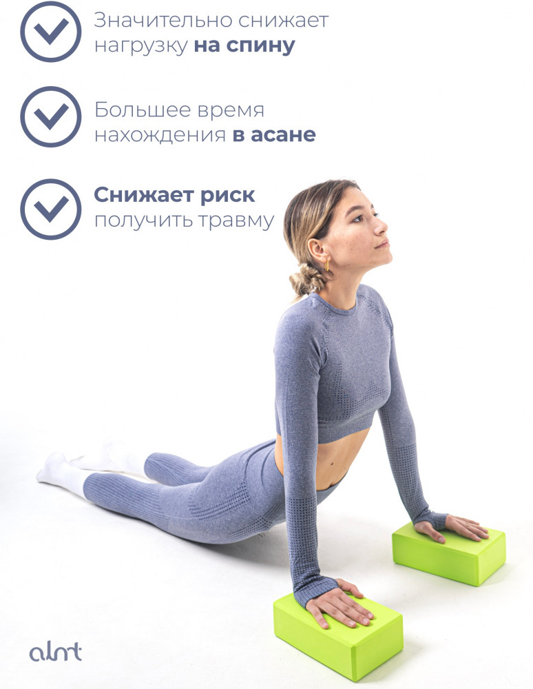 Блок для йоги — отличный помощник новичкам для сохранения равновесия и обеспечения комфортного состояния в практике. Также они будут полезны для выполнения асан и профессионалам. В зависимости от асаны применяются один или несколько блоков. Служат дополнительной опорой для головы, плеч, поясницы, ног или рук. Помогают сохранять баланс и увеличивать время нахождения в позе.
