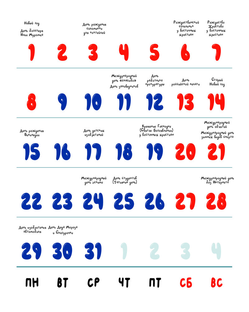 Знаете ли вы, когда будет День петербургских кошек и котов? А какой день посвящен числу пи? Когда отмечают День китов, а когда — Всемирный день блондинок? Хотите узнать, когда день рождения... у Википедии? Отпраздновать вместе со всем миром День объятий?