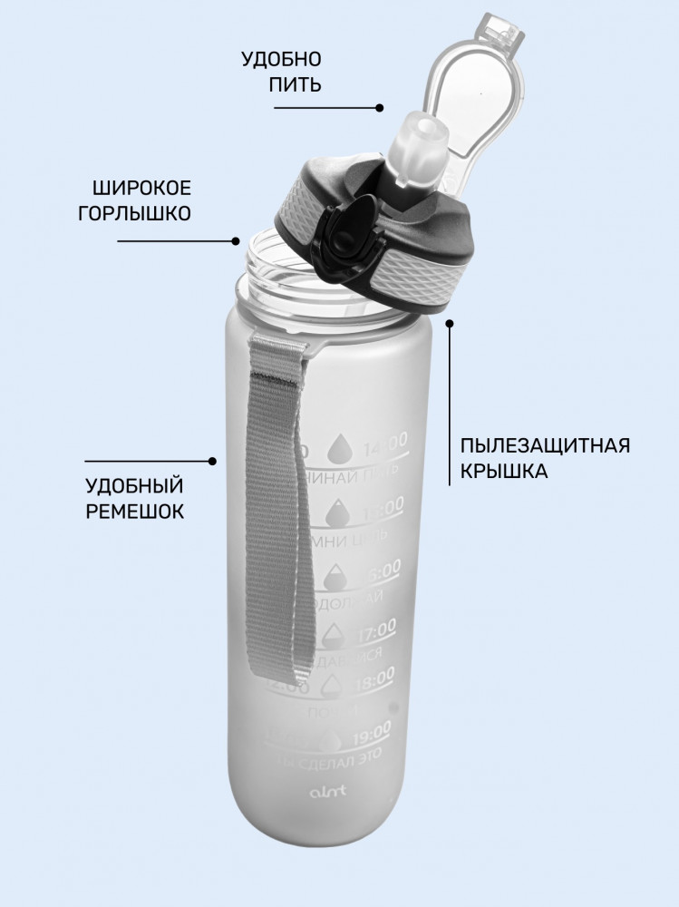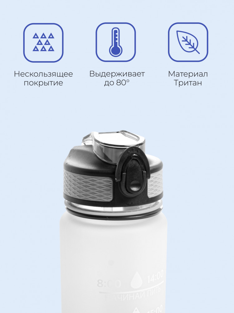 Качественный tritan — это безопасный материал без содержания бис фенола, тем самым не принесет вреда вам и окружающей среде. Благодаря данному материалу бутылка устойчива к трещинам и сколам. Пластиковая бутылочка имеет комфортный размер, что позволяет удобно держать и открывать, благодаря специальному покрытию «soft touch» она не скользит. На крышке есть силиконовый поильник с трубочкой, так же на ней предусмотрен замок который нужно поднять вверх при закрытой крышке что позволит устранить непроизвольное открывание. Под закручивающейся крышкой установлена силиконовая манжета предотвращающая протекание жидкости. У бутыли есть ремешок для подвешивания на руку или велосипед. Благодаря большой емкости и разнообразию ярких цветов, подойдет для женщин и мужчин.