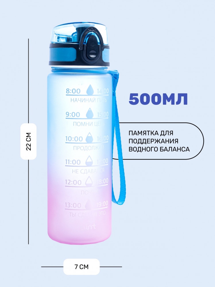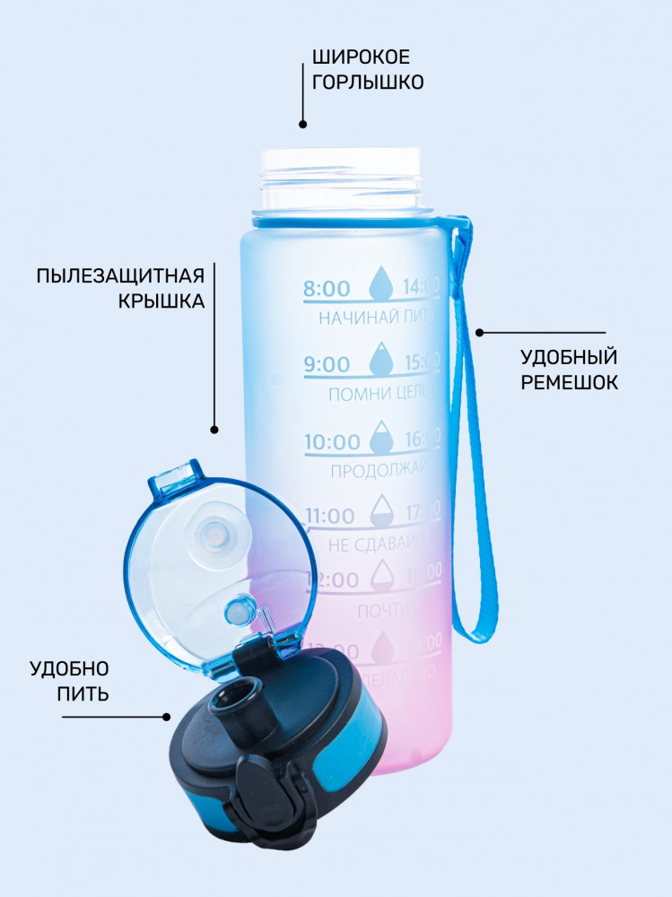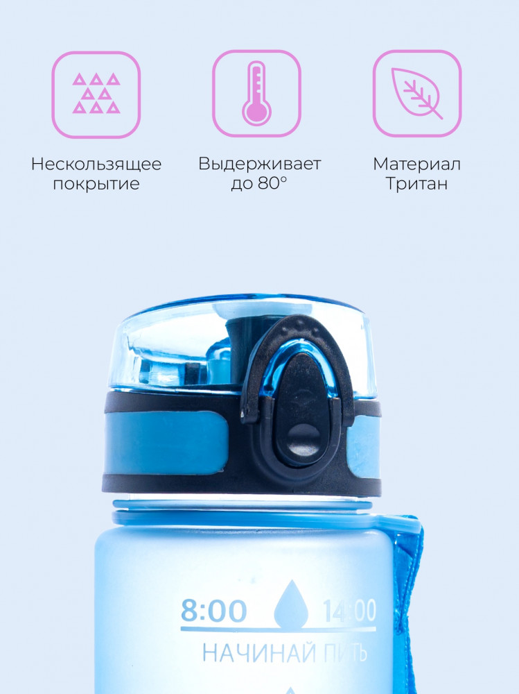 Качественный tritan — это безопасный материал без содержания бис фенола, тем самым не принесет вреда вам и окружающей среде. Благодаря данному материалу бутылка устойчива к трещинам и сколам. Пластиковая бутылочка имеет комфортный размер, что позволяет удобно держать и открывать, благодаря специальному покрытию «soft touch» она не скользит. На крышке есть силиконовый поильник с трубочкой, так же на ней предусмотрен замок который нужно поднять вверх при закрытой крышке что позволит устранить непроизвольное открывание. Под закручивающейся крышкой установлена силиконовая манжета предотвращающая протекание жидкости. У бутыли есть ремешок для подвешивания на руку или велосипед. Благодаря большой емкости и разнообразию ярких цветов, подойдет для женщин и мужчин.