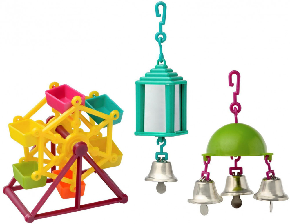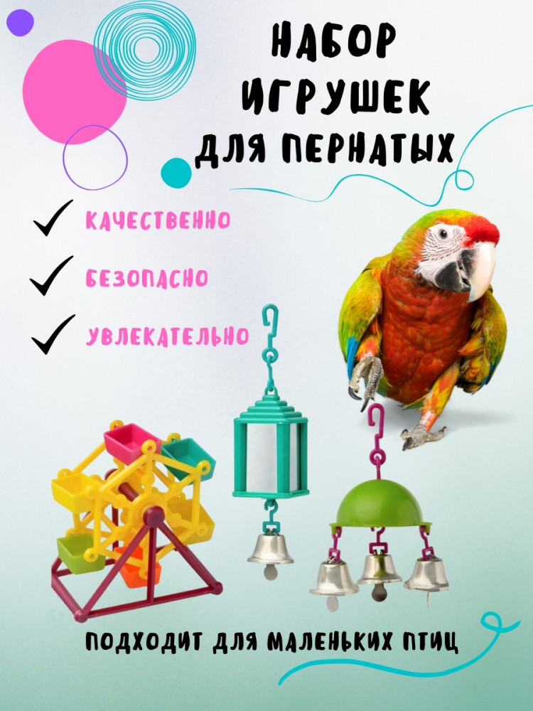 Отличный набор! Сомневалась на счёт карусельки, но нет, попугаям понравилась и она. Все игрушки яркие, зеркала в подвеске настоящие, колокольчики умеренной звонкости.