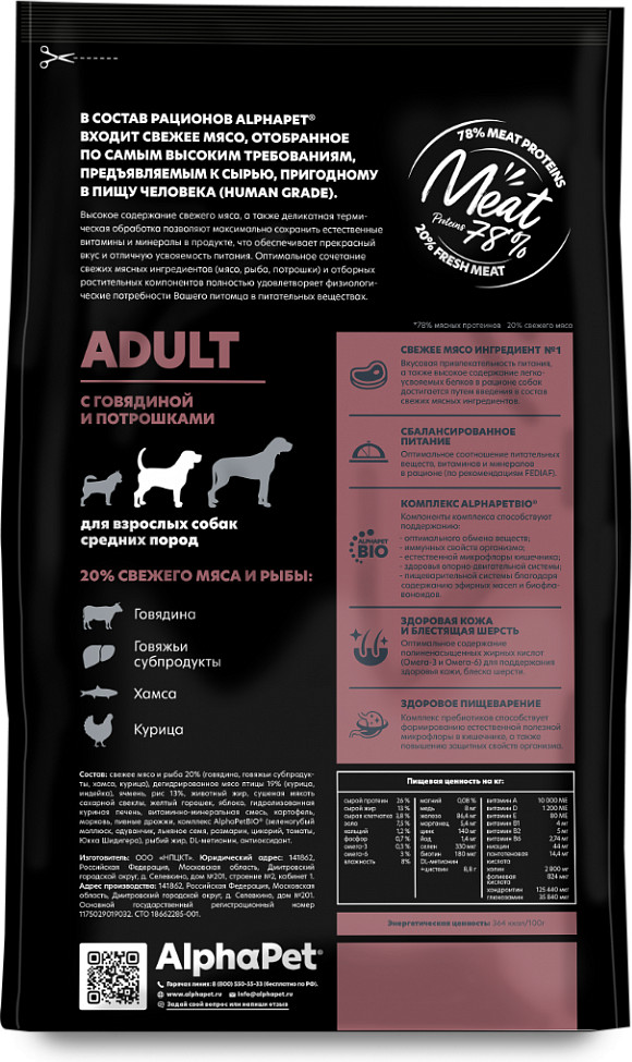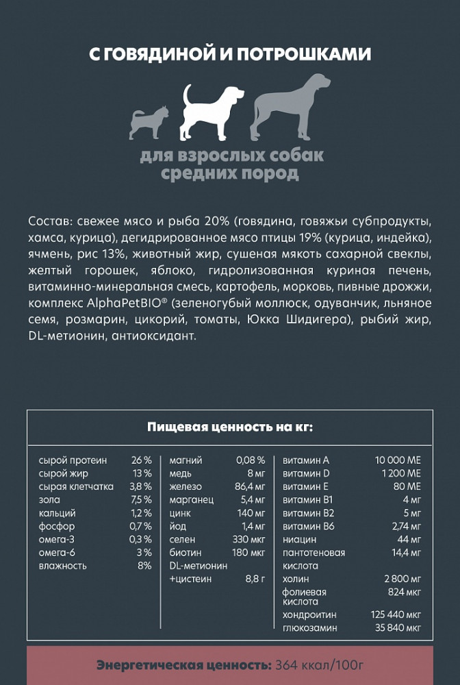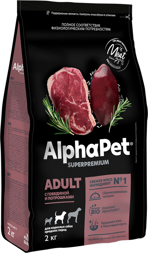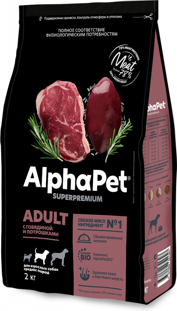 AlphaPet Корм для взрослых собак средних пород с говядиной и потрошками