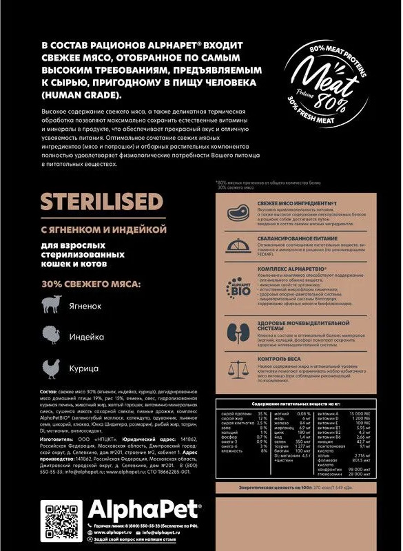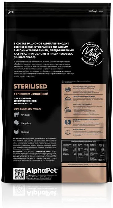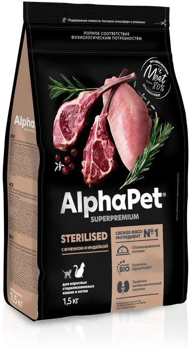 AlphaPet Корм для взрослых стерилизованных кошек и котов с ягнёнком и индейкой