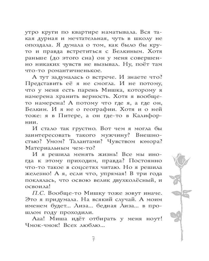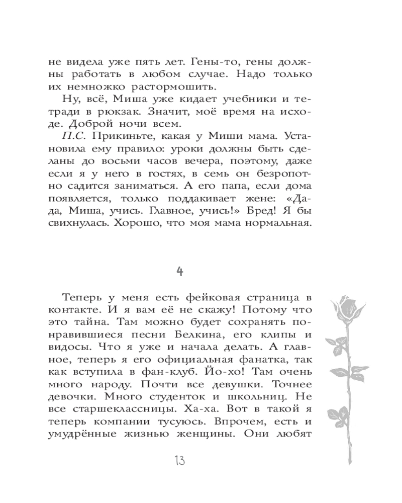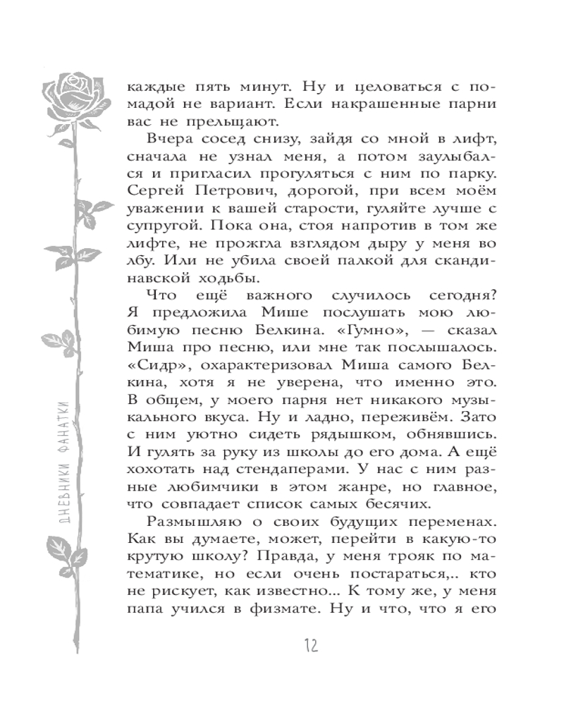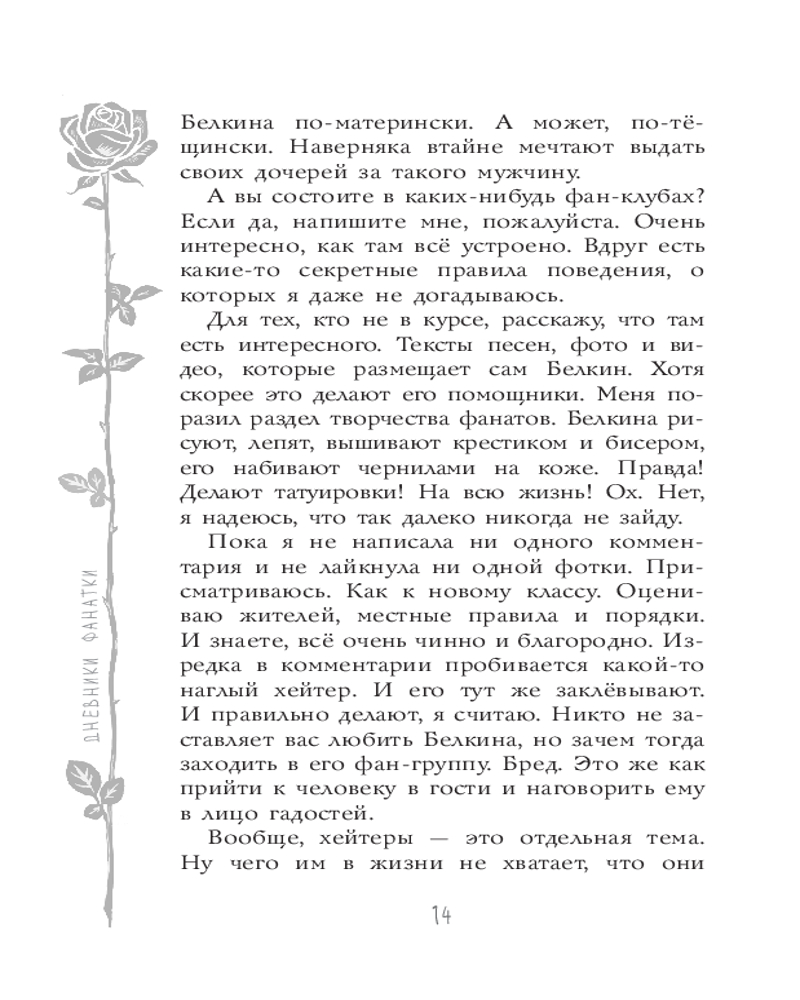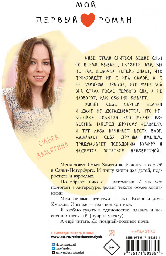 Дневники фанаткиВ данный момент этот товар отсутствует в продаже. Возможно, у нас найдется аналогичный или похожий товар здесь. Серия: Мой первый роман «Дневники фанатки» — это новая повесть Ольги Замятиной. Лиза жила обычной скучной жизнью, встречалась с Мишей, слушала с ним дурацкую музыку, пока в её жизнь не ворвался кумир. Он пришёл к ней во сне, и девочка увлеклась творчеством известного певца. Теперь Лиза ведёт блог, где рассказывает о вещих снах и событиях своей жизни, учится фотографии, хочет похудеть, стать лучше ради своего кумира и попасть на его концерт. Только Мише, Лизиному парню, в её жизни остаётся всё меньше места... Для среднего школьного возраста. |