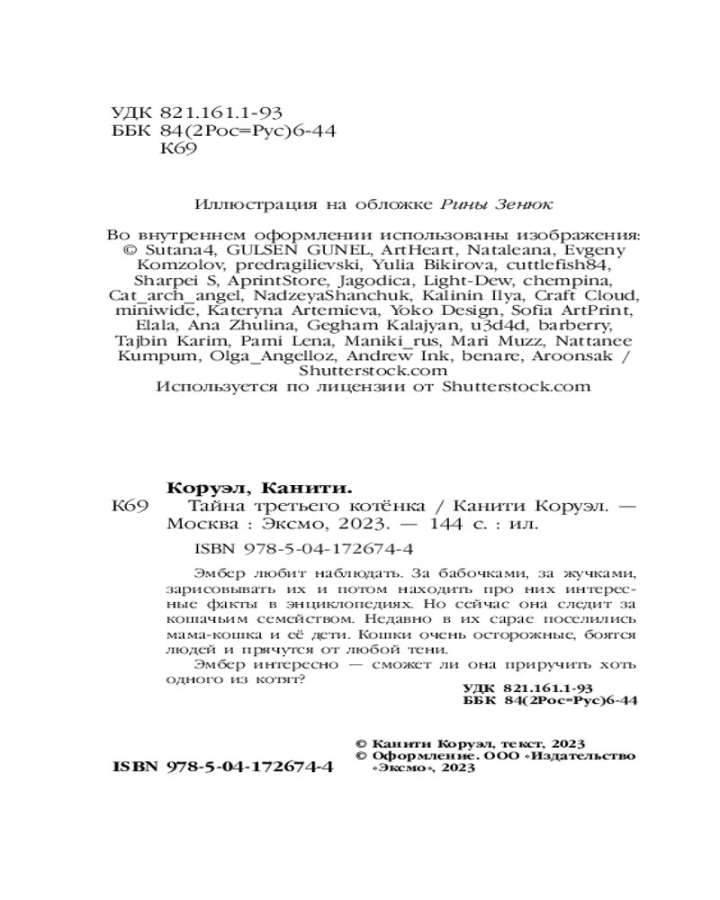 Серия: Детск. Истории для уютного чтения Книга — котёнок, книга — щенок! Для тех, кто любит книги Холли Вебб и истории с хорошим концом! Канити Коруэл — молодая британская писательница. Она с детства любила животных и литературу, поэтому её уютные антистресс-истории про котят и щенят пронизаны вниманием к эмоциям главных героинь и повадкам их питомцев. Книга издана на белой бумаге с чёрно-белыми иллюстрациями. Крупный шрифт позволит читателям не перегружать глаза. Это книги для детей 6 лет и старше. А обложку нарисовала знаменитая художница Рина Зенюк, автор синих котов!  |