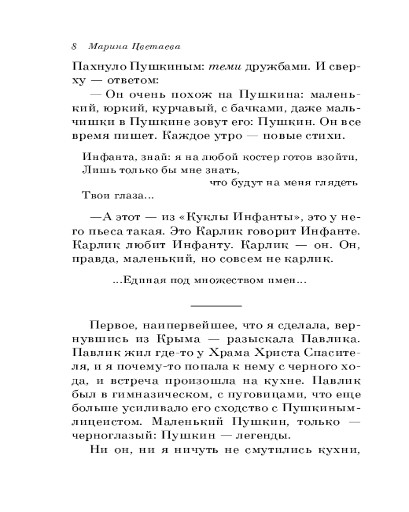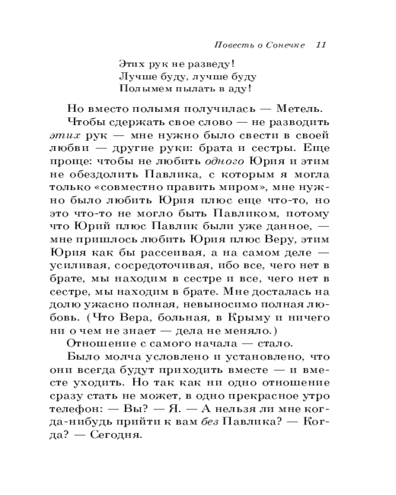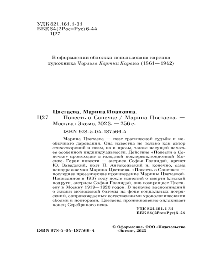 Повесть о СонечкеВ данный момент этот товар отсутствует в продаже. Возможно, у нас найдется аналогичный или похожий товар здесь. Серия: Pocket Book (обложка) Марина Цветаева — поэт трагической судьбы и необычного дарования. Она известна не только как автор стихотворений и поэм, но и прозы, также несущей печать ее особенной индивидуальности. Действие «Повести о Сонечке» происходит в голодной послереволюционной Москве. Герои повести — актриса Софья Голлидэй, артист Ю. Завадский, поэт П. Антокольский и, конечно, сама неподражаемая Марина Цветаева. |