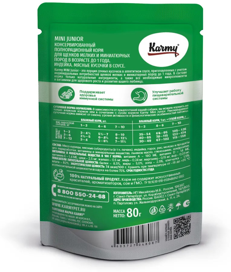 Karmy Корм для для щенков мелких пород «Индейка в соусе»