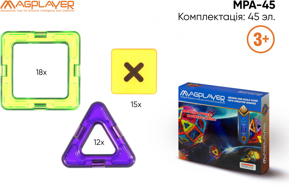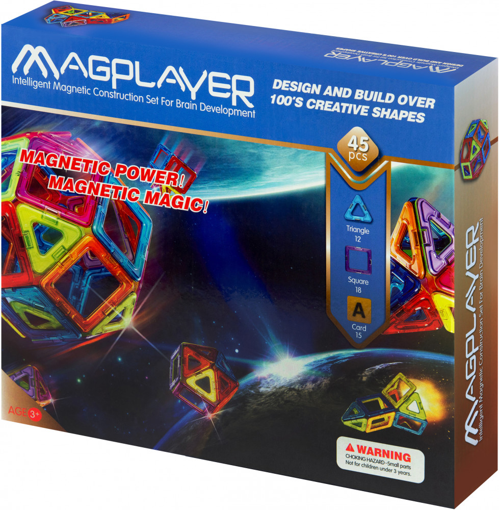 💳 Оплатить за товар можно при получении 🇰🇿 Есть бесплатная доставка по Казахстану от 1 дня 🎁 Копите бонусы с каждой покупки Магнитный конструктор MagPlayer с 45 деталями в наборе будет развивать у детей творчество, пространственное воображение и логику. В набор входят элементы в форме треугольников и квадратов, а также карточки с буквами, цифрами и математическими знаками. Магнитные крепления элементов прочно фиксируют их между собой и позволяют играть собранными фигурками. Набор поставляется с простыми схемами для составления фигур. Поэтому даже самые маленькие дети смогут самостоятельно составлять конструктор. |