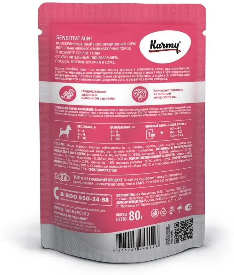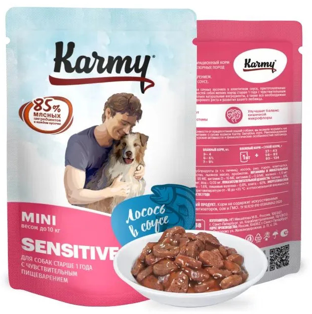Karmy Корм для собак мелких пород с чувствительным пищеварением «Лосось в соусе»-20% +8