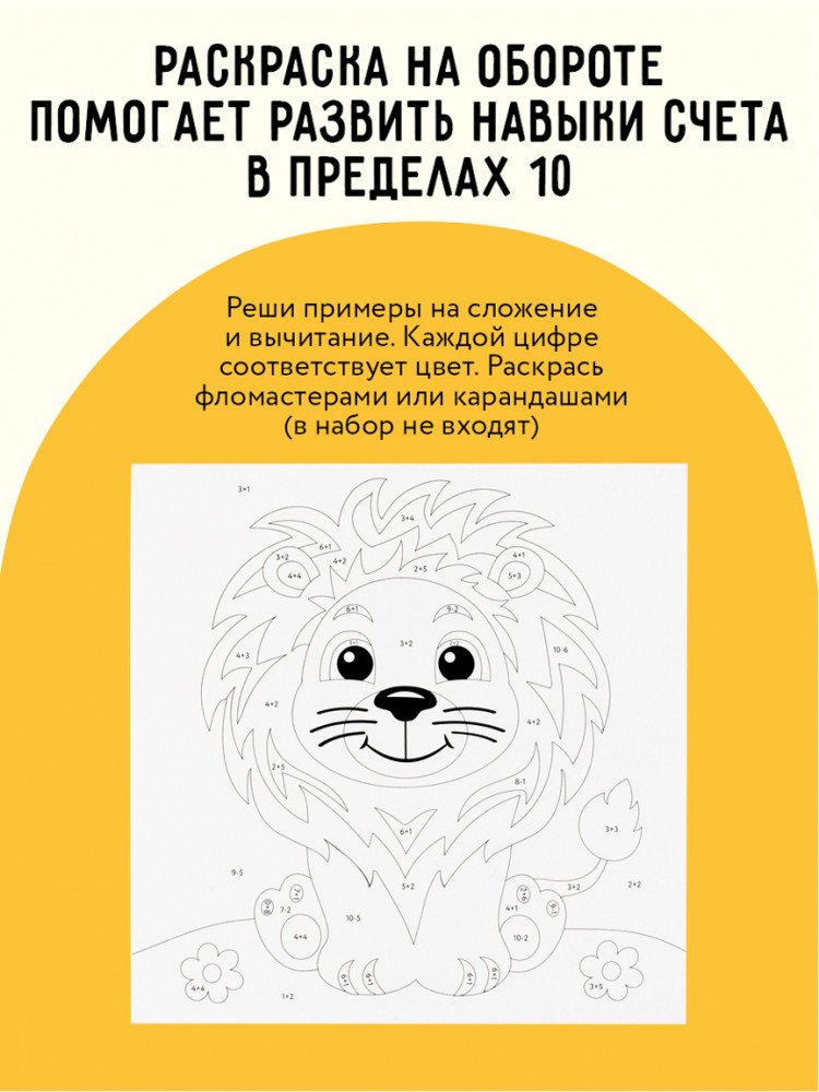На оборотной стороне аппликации расположена раскраска по номерам. Решай примеры на сложение и вычитание. Каждой цифре соответствует цвет. Раскрась фломастерами или карандашами. Подобное хобби позволит провести досуг в семейном кругу не только приятно, но и с пользой!