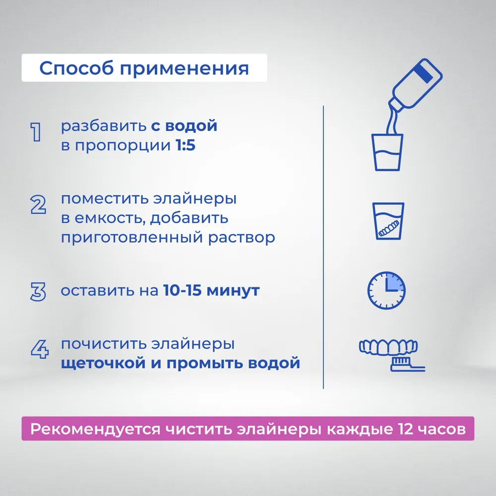 💳 Оплатить за товар можно при получении 🇰🇿 Есть бесплатная доставка по Казахстану от 1 дня 🎁 Копите бонусы с каждой покупки Особая концентрированная формула содержит активные компоненты, которые способствуют эффективному и деликатному очищению поверхности элайнеров, поддерживая их чистоту и естественный вид, оказывают антибактериальное действие. Масло перечной мяты придает ощущение свежести. |
