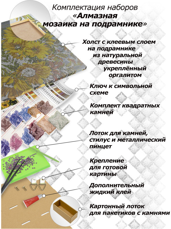 💳 Оплатить за товар можно при получении 🇰🇿 Есть бесплатная доставка по Казахстану от 1 дня 🎁 Копите бонусы с каждой покупки Блестящая картина из квадратных камней 2,5 × 2,5 мм. в размере 30 × 40 см. Основа картины — холст, натянутый на подрамник, для придания крепости конструкции подрамник усилен листом оргалита. На холст нанесена цветная схема с контрастными условными обозначениями, схему покрывает высококачественный клеевой слой, сверху слой закрыт пленкой. |