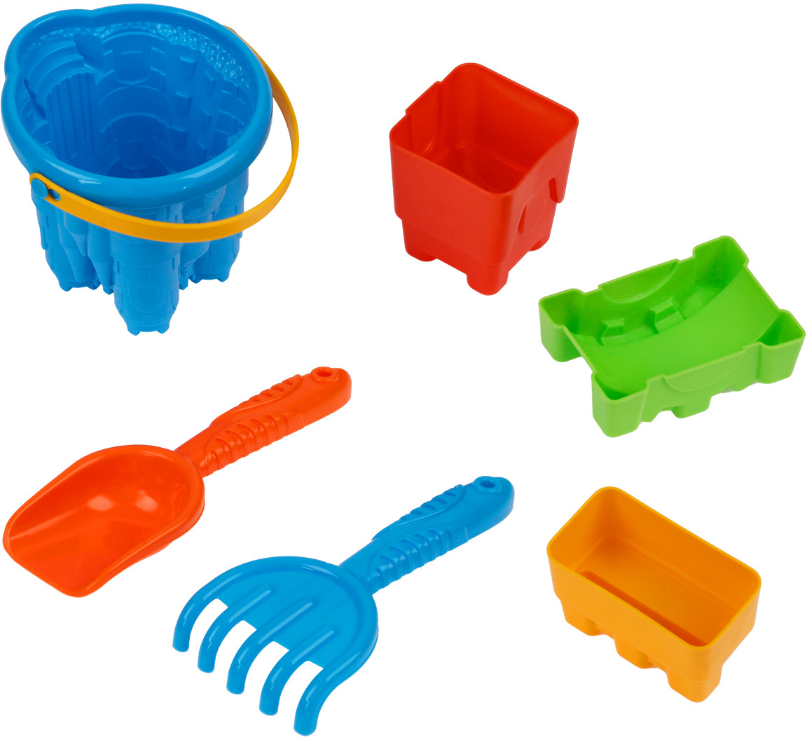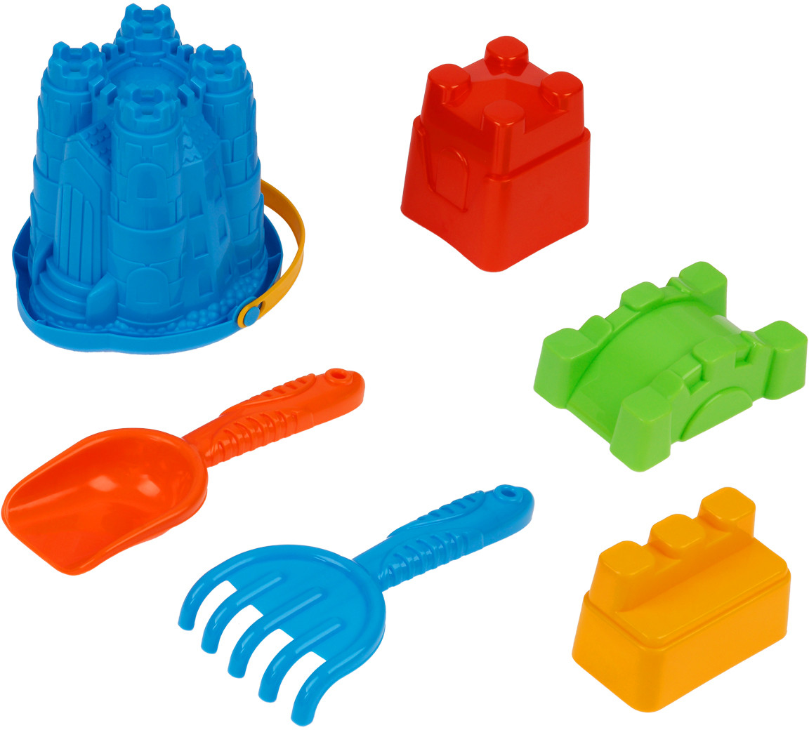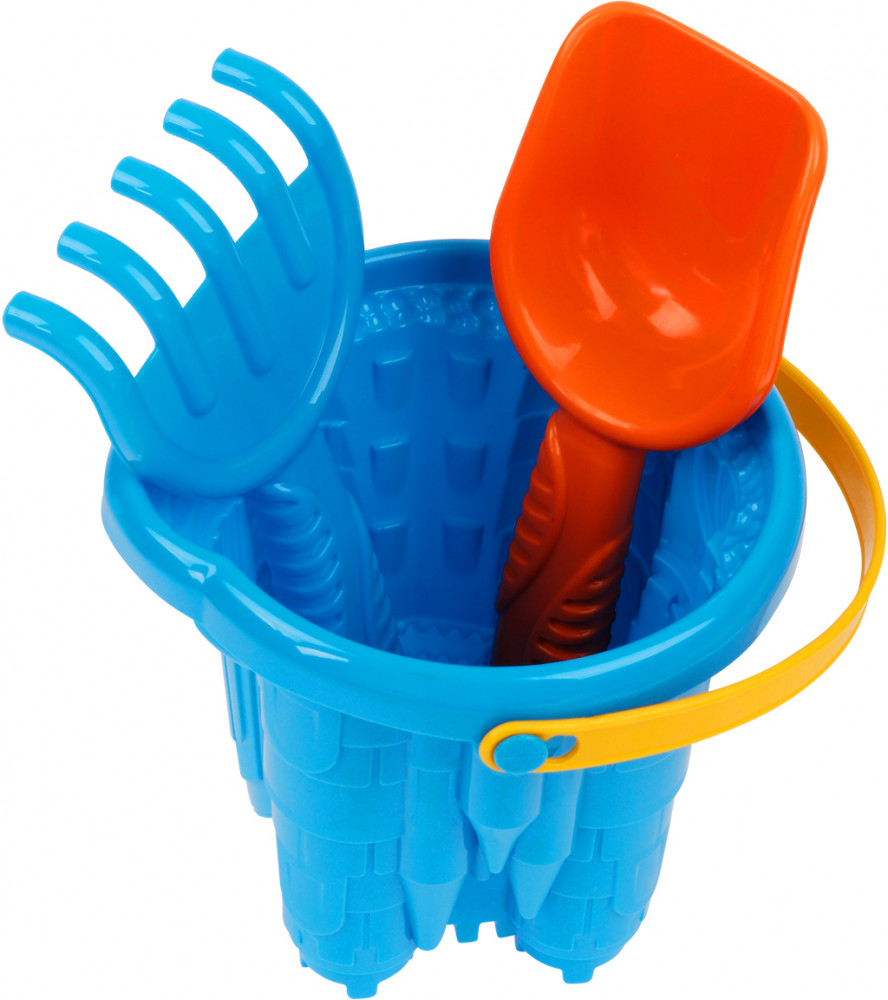 Набор включает самые необходимые инструменты для игры в песочнице. В набор «Замок» входят 6 предметов: совочек и грабельки с удобными ручками, ведерко-замок и три формочки. Отличительная черта данного ведра в том, что оно имеет высокую степень деталировки как снаружи, так и внутри. За счет этого у ребенка получится красивый, величественный замок. Ведро не развалится под весом песка или воды, поскольку сделано из толстой пластмассы. А формочки помогут возвести вокруг замка неприступную крепость.