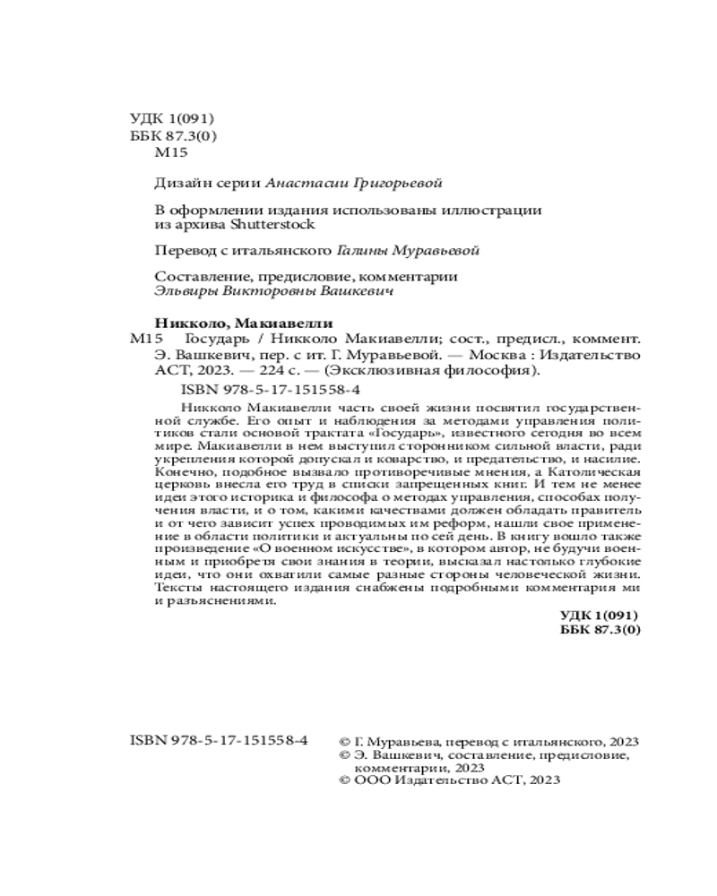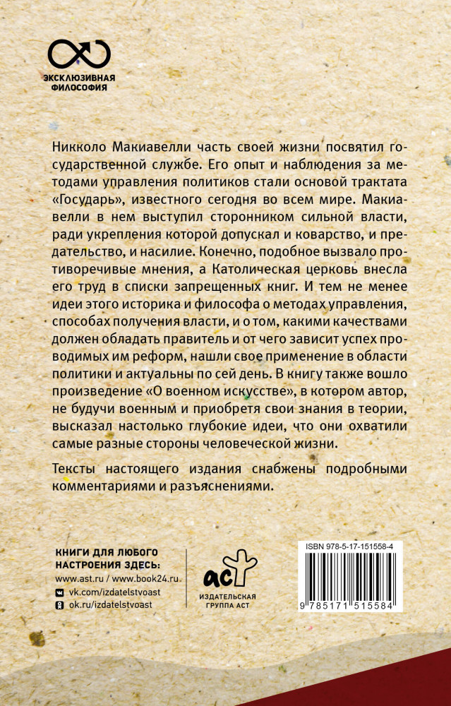 ГосударьНикколо Макиавелли (Макьявелли) В данный момент этот товар отсутствует в продаже. Возможно, у нас найдется аналогичный или похожий товар здесь. Серия: Эксклюзивная философия Никколо Макиавелли часть своей жизни посвятил государственной службе. Его опыт и наблюдения за методами управления политиков стали основой трактата «Государь», известного сегодня во всем мире. Макиавелли в нем выступил сторонником сильной власти, ради укрепления которой допускал и коварство, и предательство, и насилие. Конечно, подобное вызвало противоречивые мнения, а Католическая церковь внесла его труд в списки запрещенных книг. И тем не менее идеи этого историка и философа о методах управления, способах получения власти, и о том, какими качествами должен обладать правитель и от чего зависит успех проводимых им реформ, нашли свое применение в области политики и актуальны по сей день. |