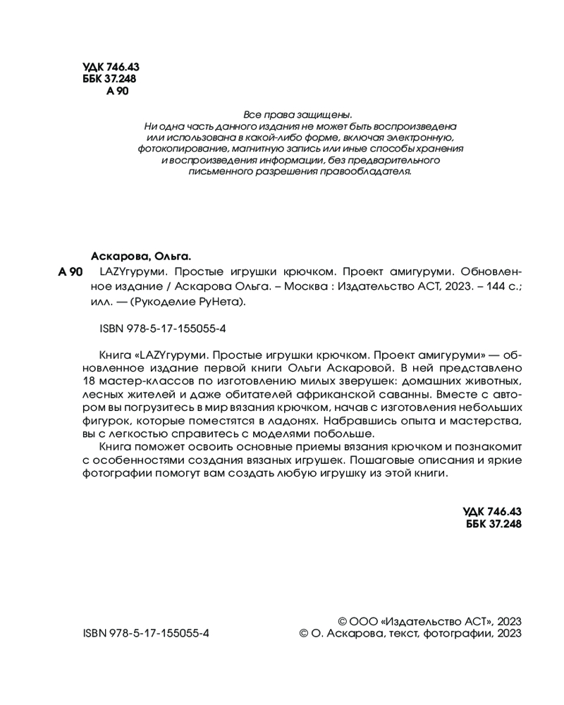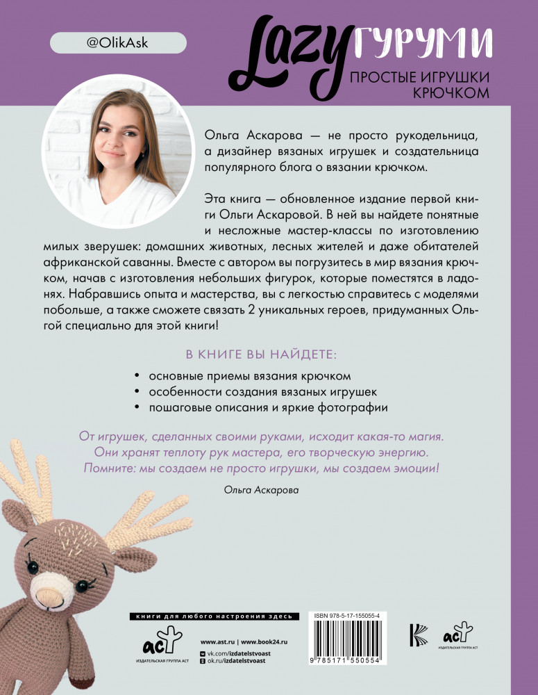 💳 Оплатить за товар можно при получении 🇰🇿 Есть бесплатная доставка по Казахстану 🎁 Копите бонусы с каждой покупки Серия: Рукоделие РуНета Ольга Аскарова — не просто рукодельница, а дизайнер вязаных игрушек и создательница популярного блога о вязании крючком. |