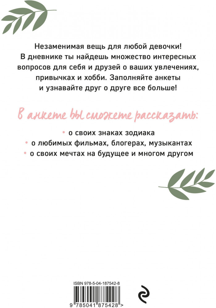 💳 Оплатить за товар можно при получении 🇰🇿 Есть бесплатная доставка по Казахстану 🎁 Копите бонусы с каждой покупки Серия: Дневнички и анкеты для девочек. Собери свои секреты, мысли и эмоции Дневничок с анкетами для друзей станет незаменимым атрибутом для каждой девочки. |