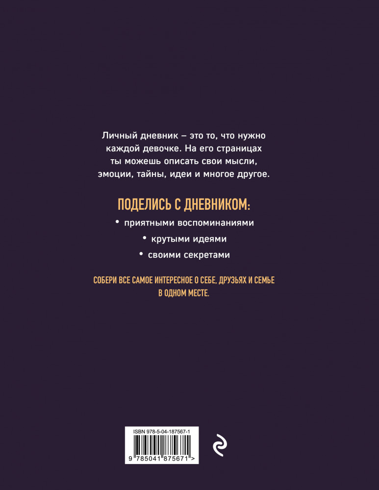 💳 Оплатить за товар можно при получении 🇰🇿 Есть бесплатная доставка по Казахстану от 1 дня 🎁 Копите бонусы с каждой покупки Серия: Дневнички и анкеты для девочек. Собери свои секреты, мысли и эмоции Личный дневник — это то, что нужно каждой девочке. Он помогает лучше понять и узнать себя, обдумать прошедший день, свои успехи и неудачи, а также передать мысли и эмоции с помощью творчества. В нем можно собрать все свои мысли, чувства, мечты, секреты, идеи, планы и многое другое. |