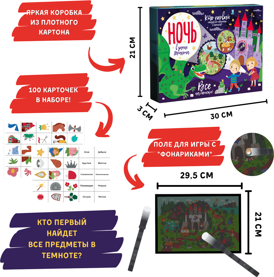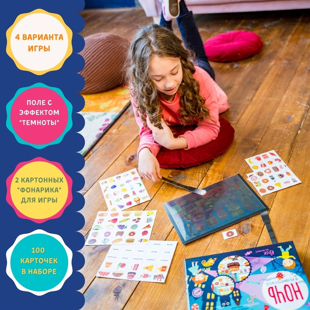 💳 Оплатить за товар можно при получении 🇰🇿 Есть бесплатная доставка по Казахстану от 1 дня 🎁 Копите бонусы с каждой покупки Ночь в замке дракона — это увлекательная настольная игра для детей и родителей. В наборе вы найдете целых 100 карточек с предметами, специальное игровое поле и 2 фонарика из картона. Переворачивайте карточки, опередите соперника и с помощью фонариков ищите на игровом поле предметы, изображенные на карточке. Выигрывает тот, кто первым найдет все предметы в «темноте». |