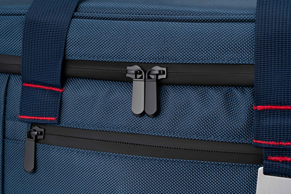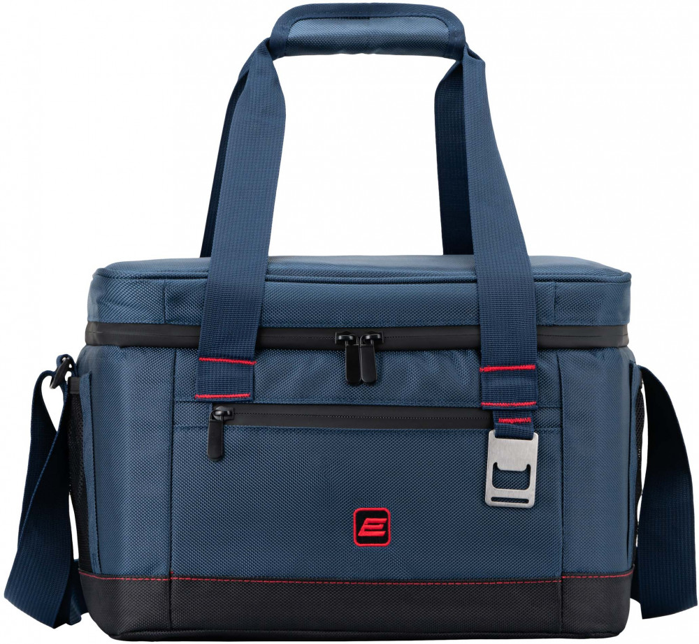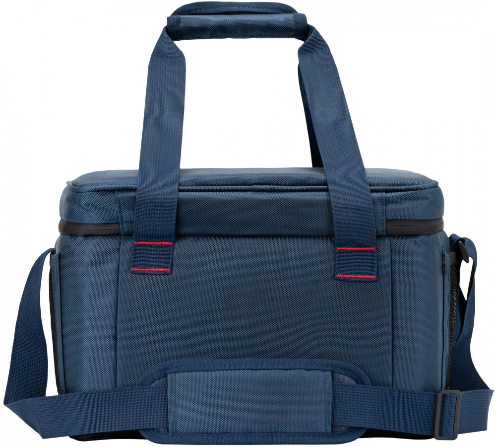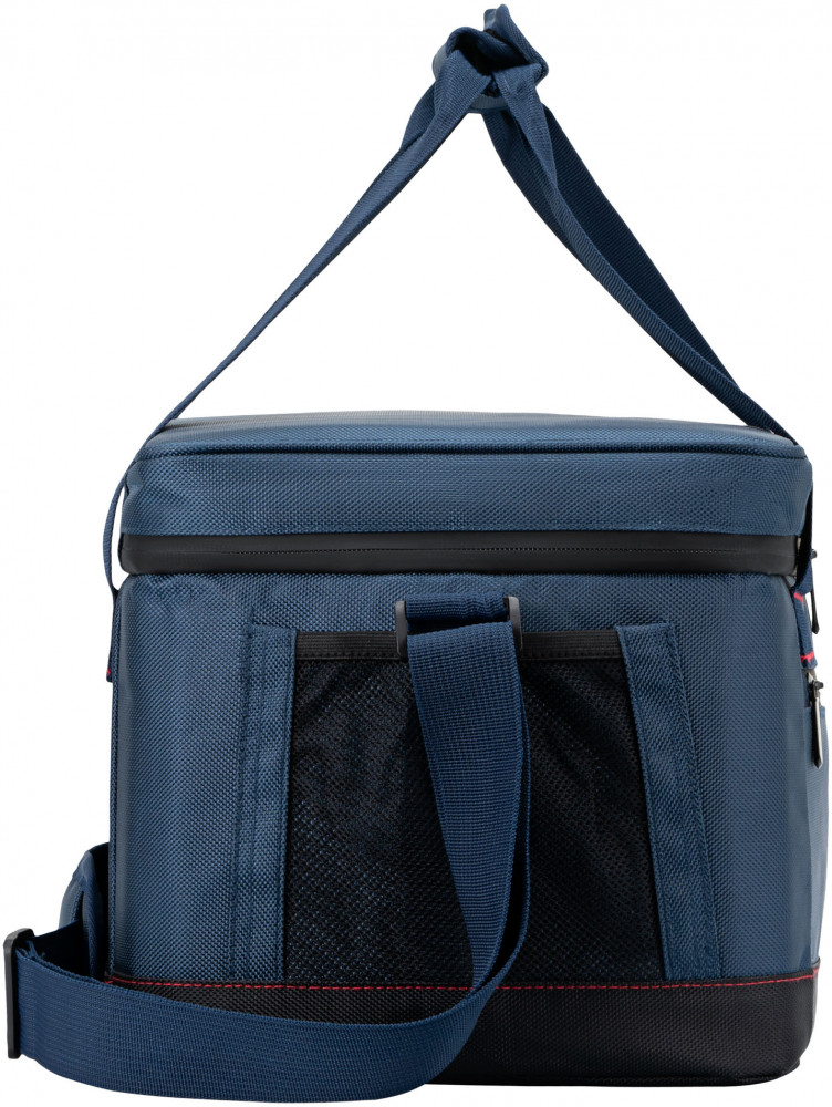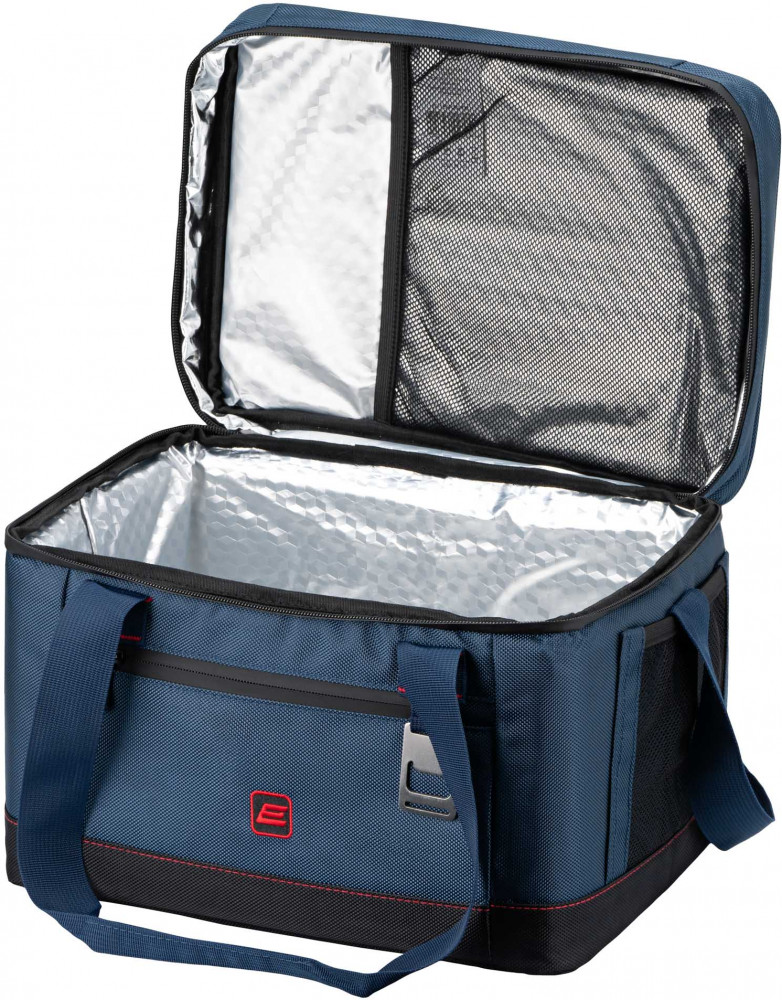 Внутри сумка покрыта особым металлизированным теплоотражающим слоем со специальной поверхностью для улучшения свойств материала сохранять температуру во внутреннем объеме постоянной более длительное время. Предусмотрены плечевой регулируемый ремешок и две ручки с амортизационной подкладкой на липучке. Все карабины, петли и замки молний — металлические.