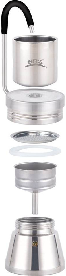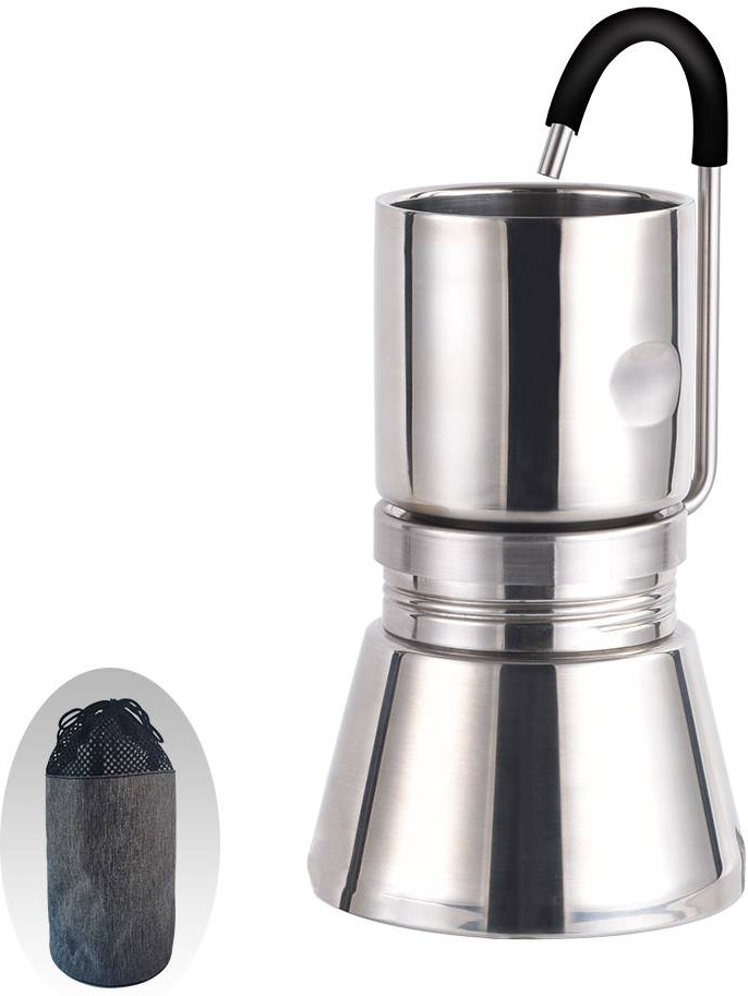 Заядлым кофеманам больше незачем пить растворимым кофе — заваривайте кофе и наслаждайтесь ароматным напитком на природе. Корпус изготовлен из стали 304. Металл не поддается коррозии и не выпускает примеси при нагревании. Объем чаши для воды 450 мл, что позволяет заварить кофе сразу на несколько кружек. Рассчитана кофеварка только на молотые зерна. Кофе заваривается гейзерным способом. Вода в большой чаше нагревается до состояния пара, который проходит через емкость с кофе. Пар вбирает в себя кофейный вкус и через трубочку собирается в чашку, установленную в верхней части устройства. Получается крепкий эспрессо, который можно разбавить горячей водой или молоком для смягчения вкуса.