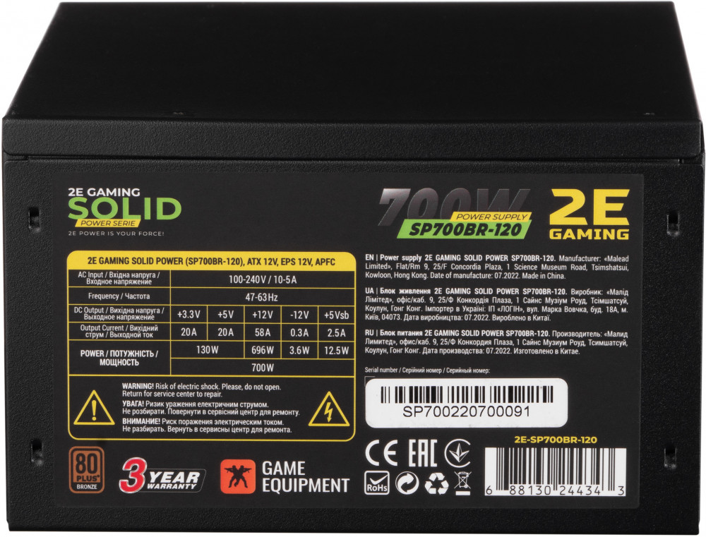 Блок питания 2E Solid Power (700W) с кабелем питания для современных персональных компьютерных систем среднего и выше уровней сложности. Обеспечит бесперебойную работу ПК при одновременном снижении излишнего энергопотребления благодаря использованию высоко производительных долговечных и надежных компонентов. Сертифицирован и соответствует стандарту 80+ Bronze.
