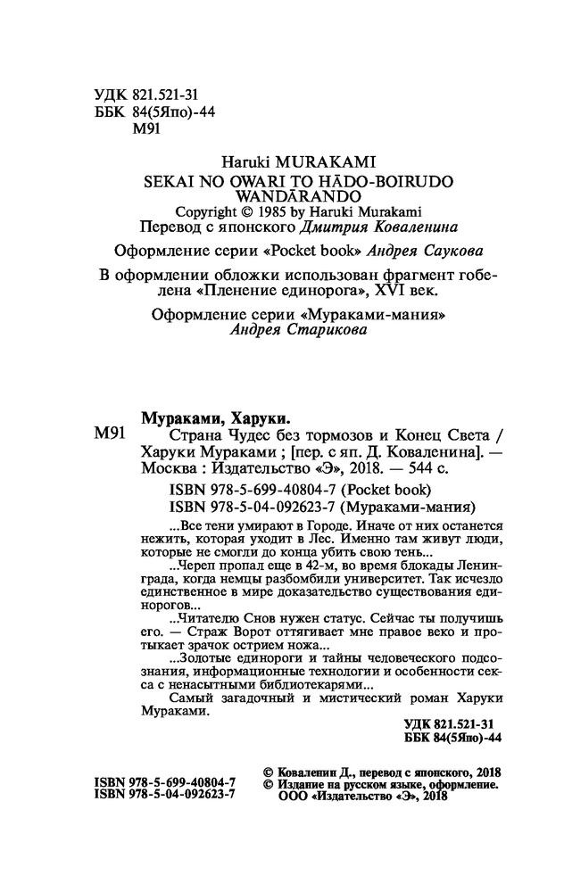 Страна Чудес без тормозов и Конец СветаВ данный момент этот товар отсутствует в продаже. Возможно, у нас найдется аналогичный или похожий товар здесь. Серия: Мураками-мания (обложка) …Все тени умирают в Городе. Иначе от них останется нежить, которая уходит в Лес. Именно там живут люди, которые не смогли до конца убить свою тень… |