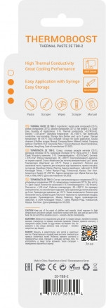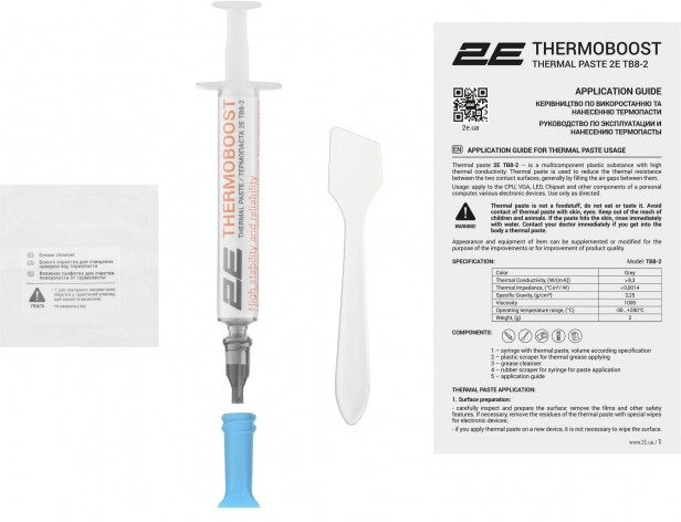Термопаста 2Е TB8-2 — многокомпонентное пластическое вещество с высокой теплопроводностью. Термопаста используется для уменьшения теплового сопротивления между двумя соприкасающимися поверхностями, а именно, за счет заполнения воздушных зазоров между ними.