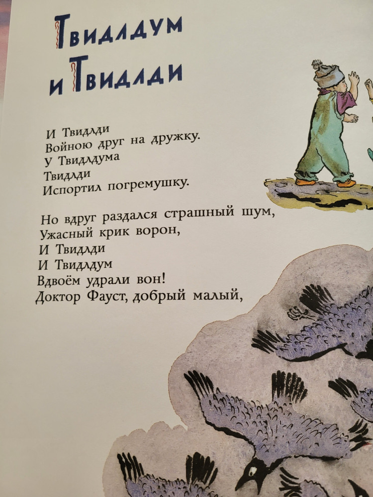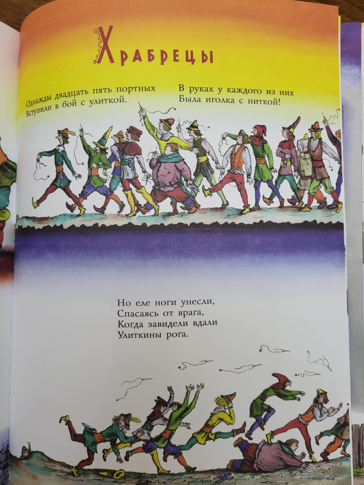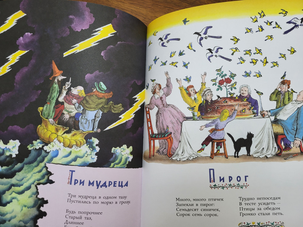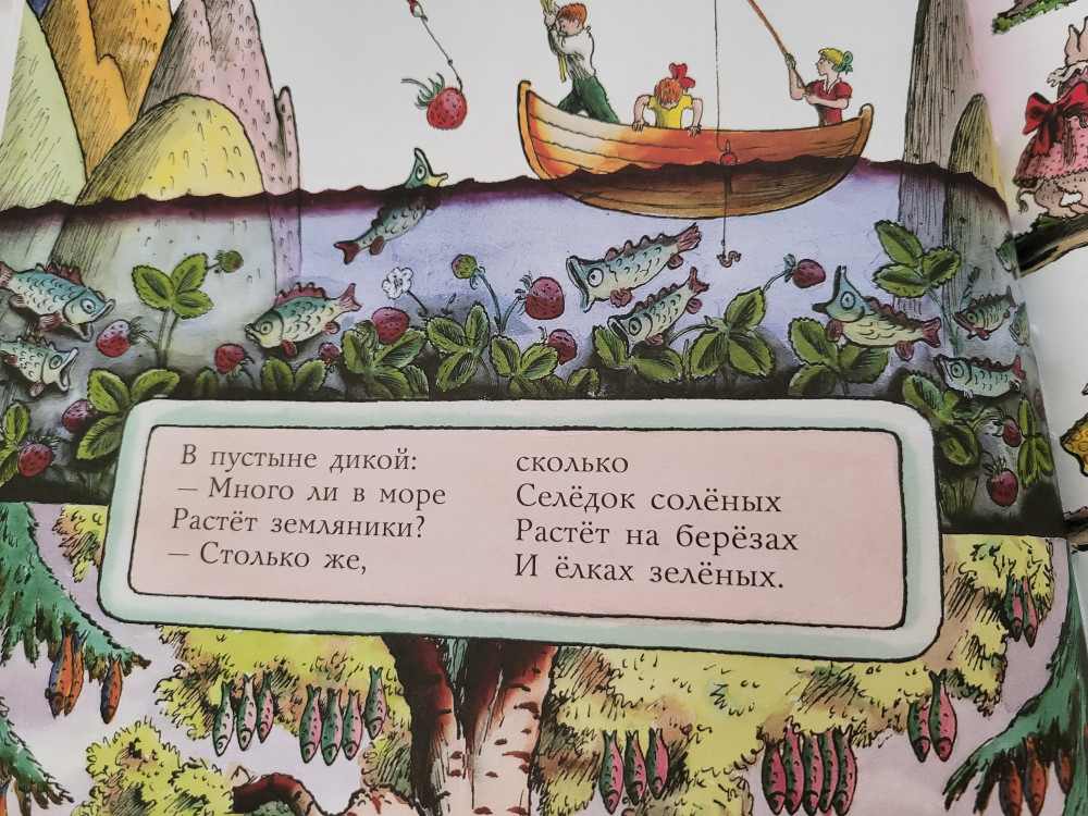 Книжка очень красивая, большая, яркая. Жаль, что с браком. Шесть стихов в середине книги заканчиваются первой строчкой следующего стихотворения. А следующее стихотворение начинается со второй строчки. Если читает детям взрослый, который знает эти стихи и может их скорректировать, то нормально. А если ребенок читает самостоятельно, то может возникнуть неясность. Брак заводской, скорее всего, весь тираж такой. Приобрела с хорошей скидкой.
